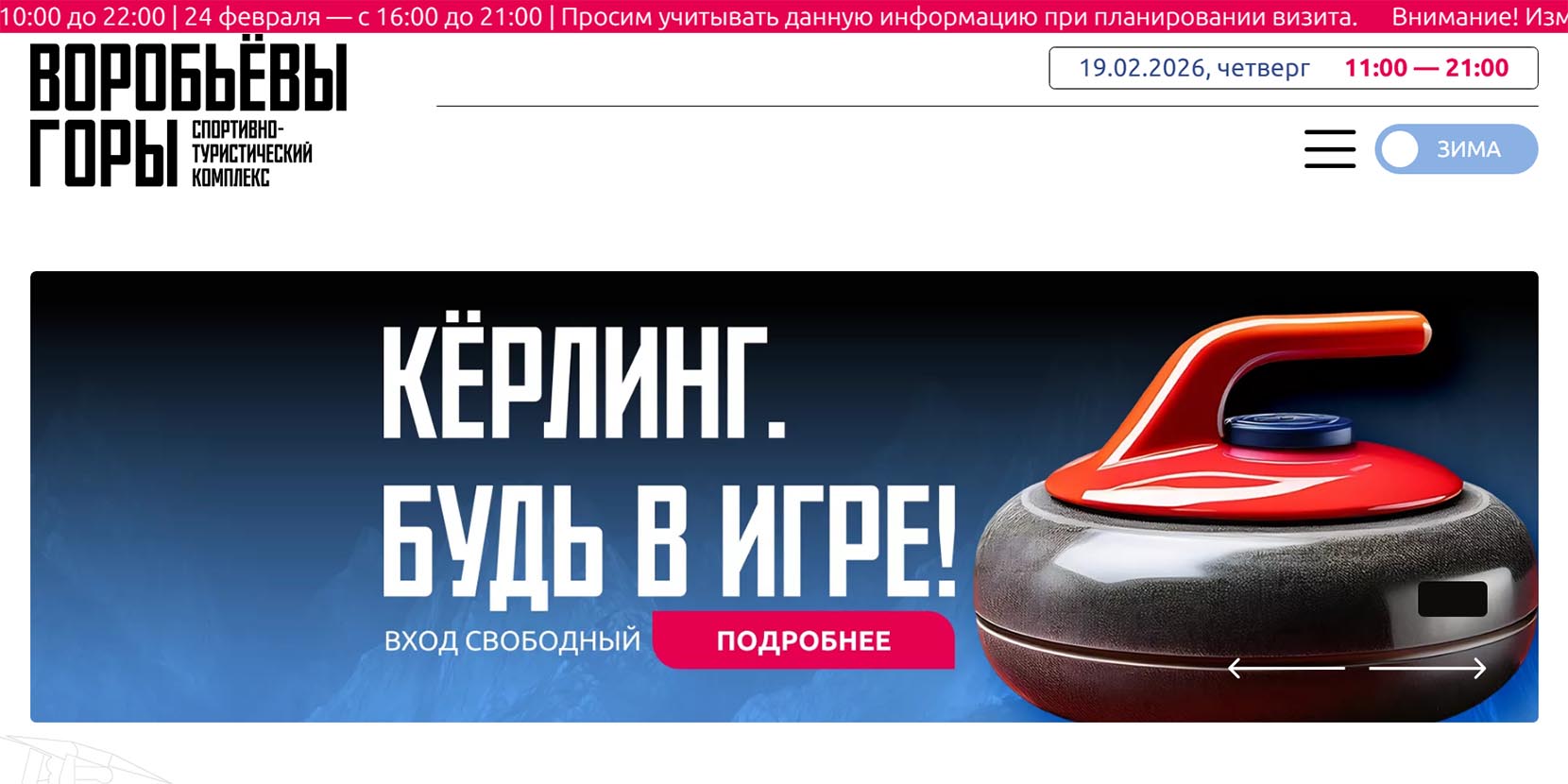 На территории спорткомплекса все желающие могут поиграть в керлинг, поучиться у профессиональных спортсменов и попробовать свои силы в мини-турнире. Игроки делятся на две команды, участникам предоставляются комплект камней, щетки, слайдеры и манишки разных цветов. Чтобы сделать свои первые шаги на льду, нужно зарегистрироваться на сайте заранее или записаться на месте (если будут свободные места).