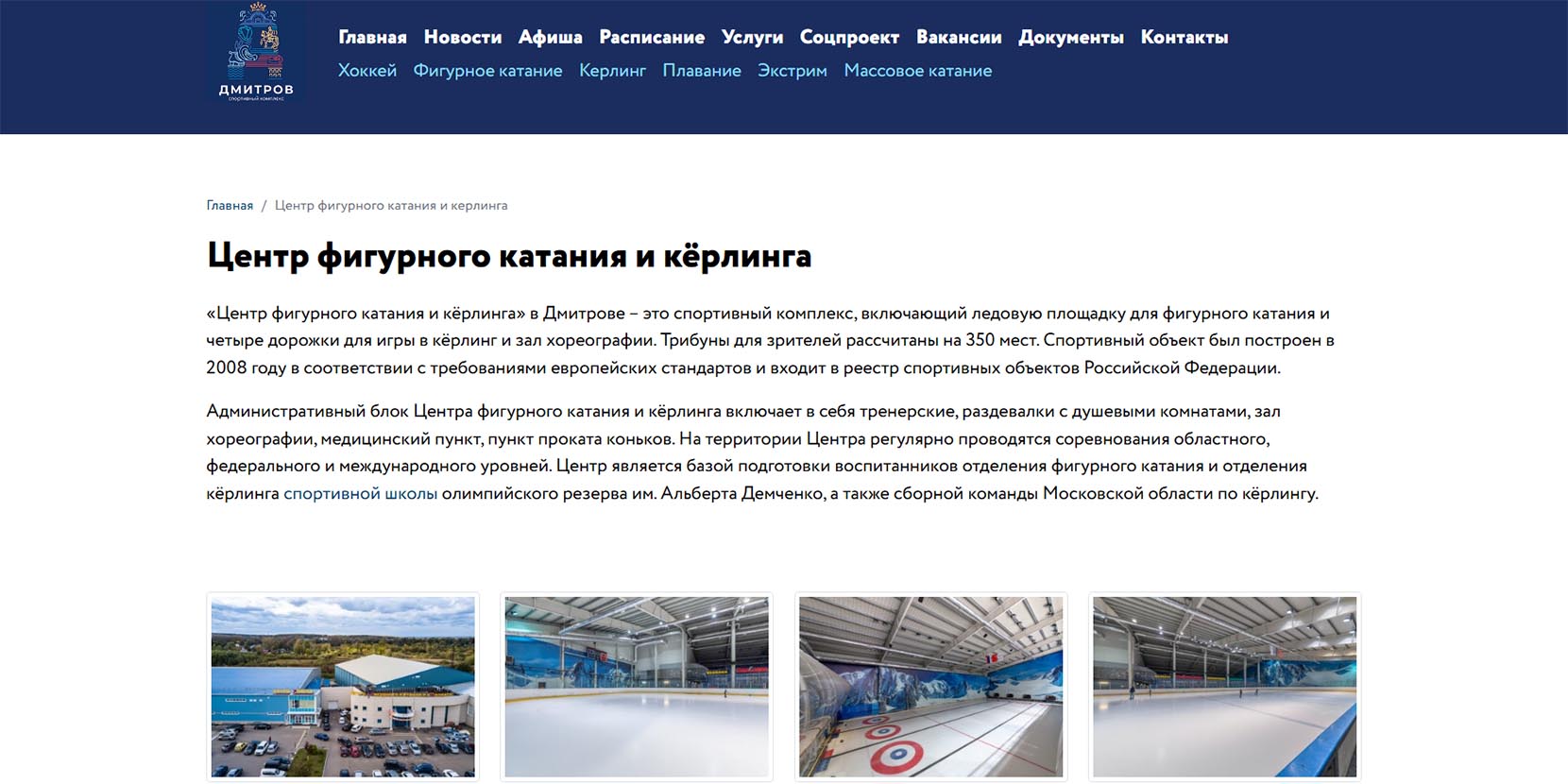 «Центр фигурного катания и керлинга» расположен на территории СК «Дмитров» с 2007 года и включает в себя 4 ледовые дорожки со специальной разметкой для игры. Здесь проходят различные соревнования и тренировки местной команды спортсменов. Для посетителей предоставляется инвентарь, есть удобные раздевалки, кафе и медицинский пункт.