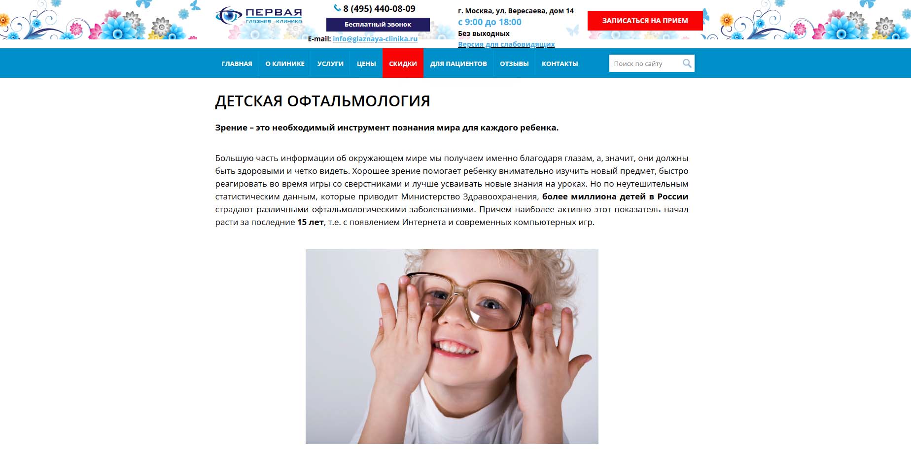 1. Специализация клиники. Многие пациенты доверяют узкоспециализированным клиникам больше, чем многопрофильным. Но в нашем случае одного слова «глазная» в названии мало — убедитесь, что клиника ведет прием по профилю именно детской офтальмологии. У детей могут быть специфические заболевания глаз, требующие особого подхода и знаний.