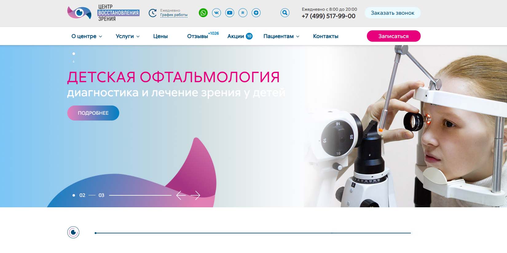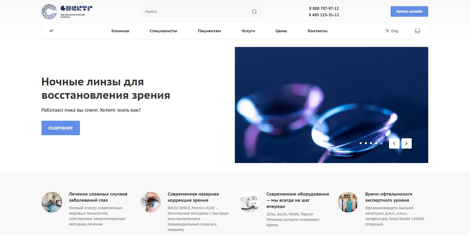 Сеть офтальмологических клиник для взрослых и детей охватывает Москву и ближайшее Подмосковье. Здесь есть операционный блок, диагностический, физиотерапевтический и процедурный кабинеты, кабинет аппаратного лечения. При необходимости маленьким пациентам проводят спектральную оптическую когерентную томографию — информативное исследование, длящееся всего несколько секунд. Также детям и подросткам предлагают ортокератологическое лечение — способ коррекции близорукости и астигматизма с помощью ночных линз.