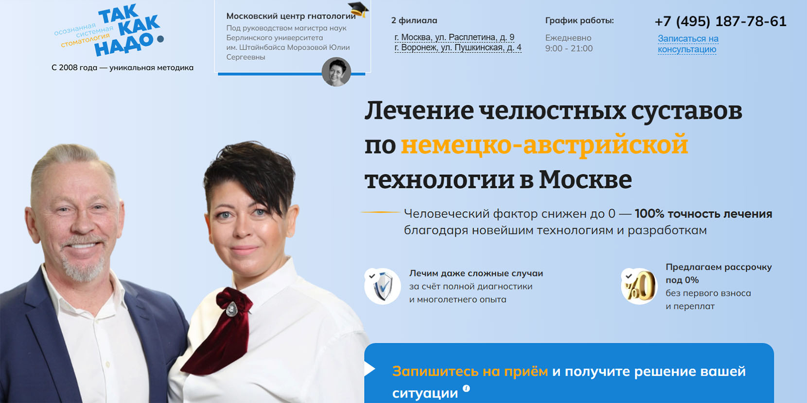 Гнатолог — это врач. Соответственно, лечить он должен в соответствии с научными исследованиями, мировым опытом, клиническими рекомендациями. Формулировки вроде «авторская методика», «уникальный подход», обещание мгновенного результата — повод задуматься о квалификации такого врача.