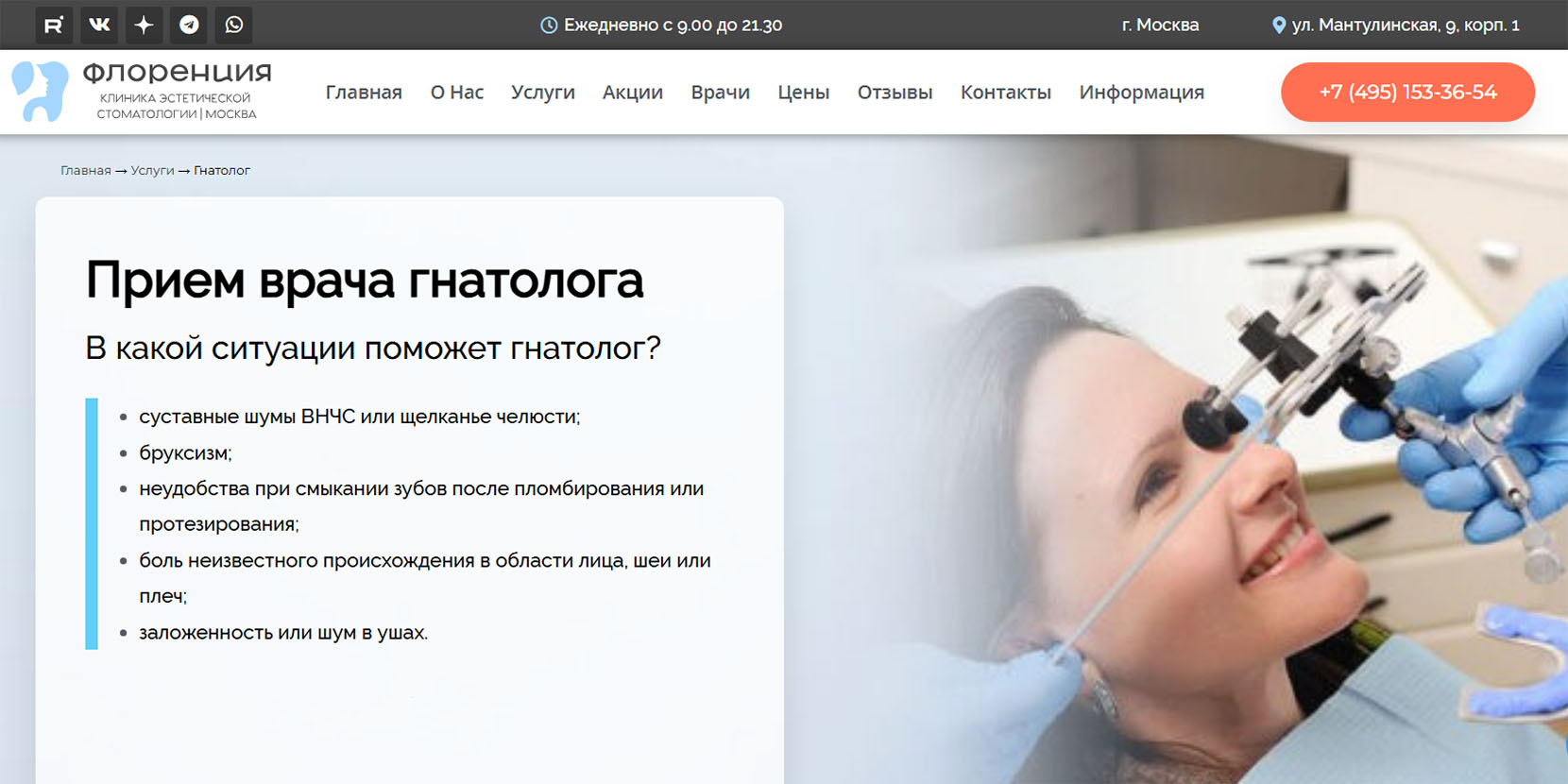 Современная клиника оказывает полный комплекс стоматологических услуг. План гнатологического лечения выстраивается по результатам подробной диагностики, которая может включать до 90 параметров. Среди гнатологов есть врачи высшей категории с опытом работы от 10 лет, заведующие отделениями и кандидаты медицинских наук. Доктора прошли обучение в Венской школе междисциплинарной стоматологии. Клиника располагает необходимым лечебно-диагностическим оборудованием европейского производства.