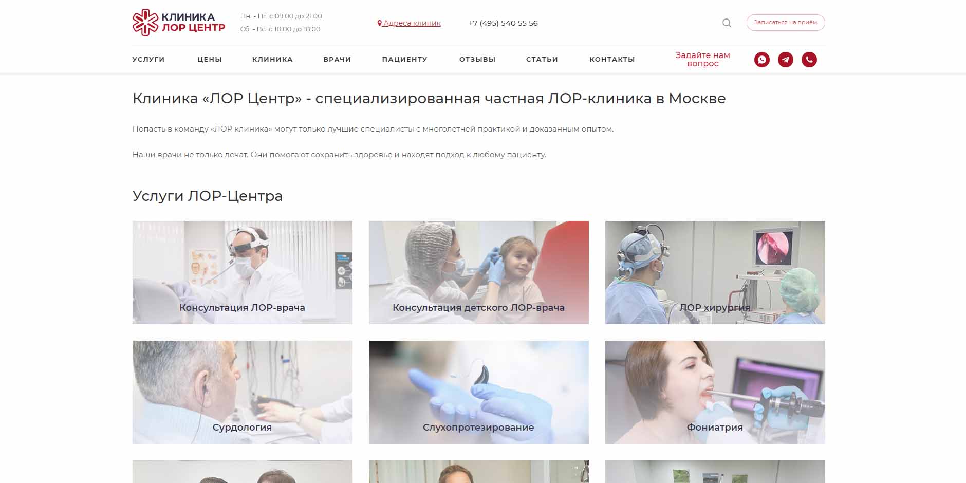 В медицинском центре лечат лор-заболевания, а также нарушения слуха у детей и взрослых. Во время каждого приема проводится полноценное эндоскопическое исследование: риноскопия, ларингоскопия и отомикроскопия. В клинике есть прием смежных докторов: аллерголога, пульмонолога, педиатра, терапевта и других. Оказывают широкий перечень услуг по лабораторной диагностике и компьютерной томографии лор-органов.