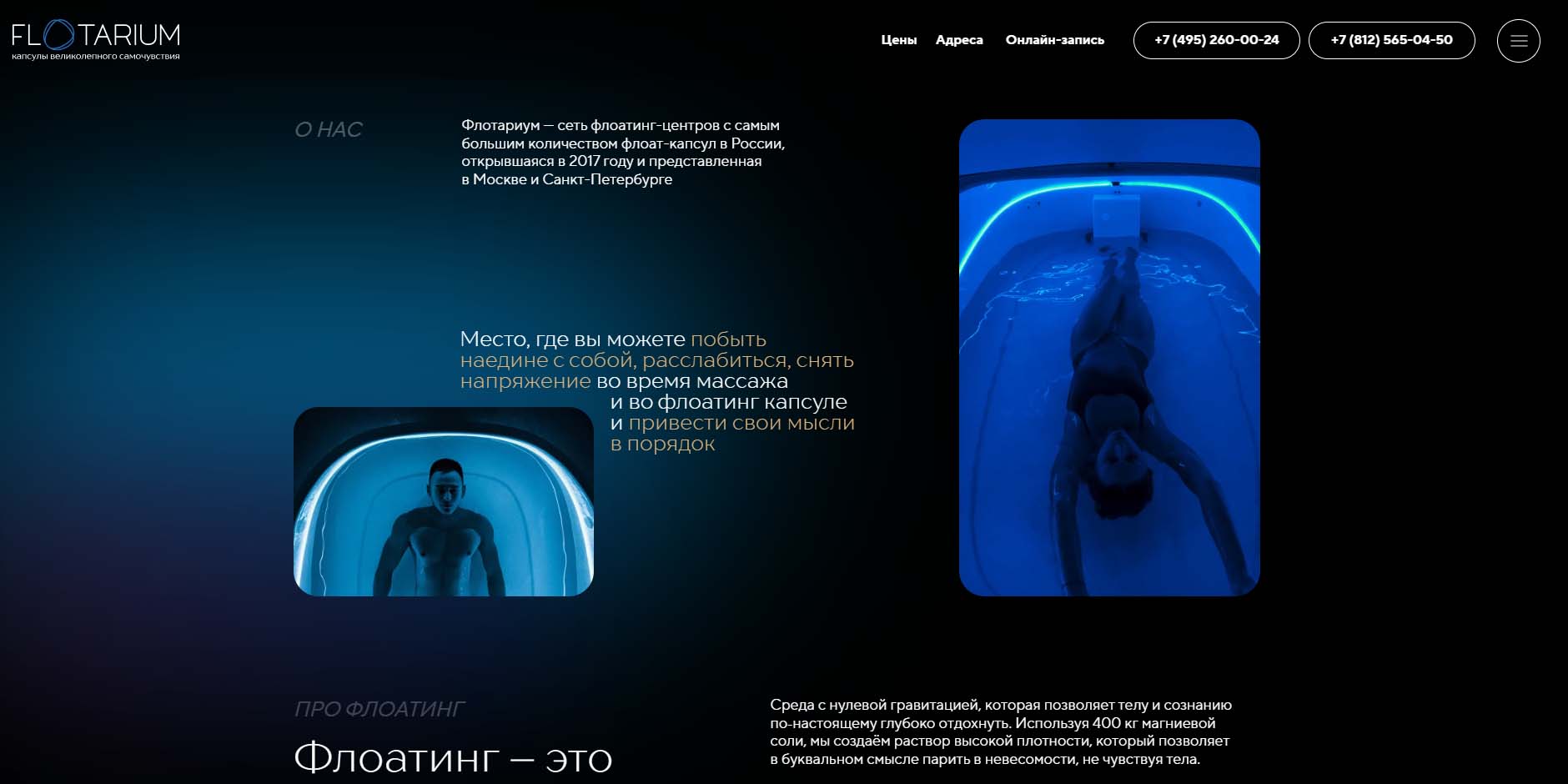 Центр спа и флоатинга на севере Москвы. Сеансы проводят в открытом бассейне, длятся они от часа до двух. Емкость для раствора просторная, поэтому можно попробовать парную процедуру для оздоровления и релаксации. В студии готовы организовать и максимально комплексную программу, которая сочетает флоатинг с парением, аромамассажем и уходовыми процедурами.