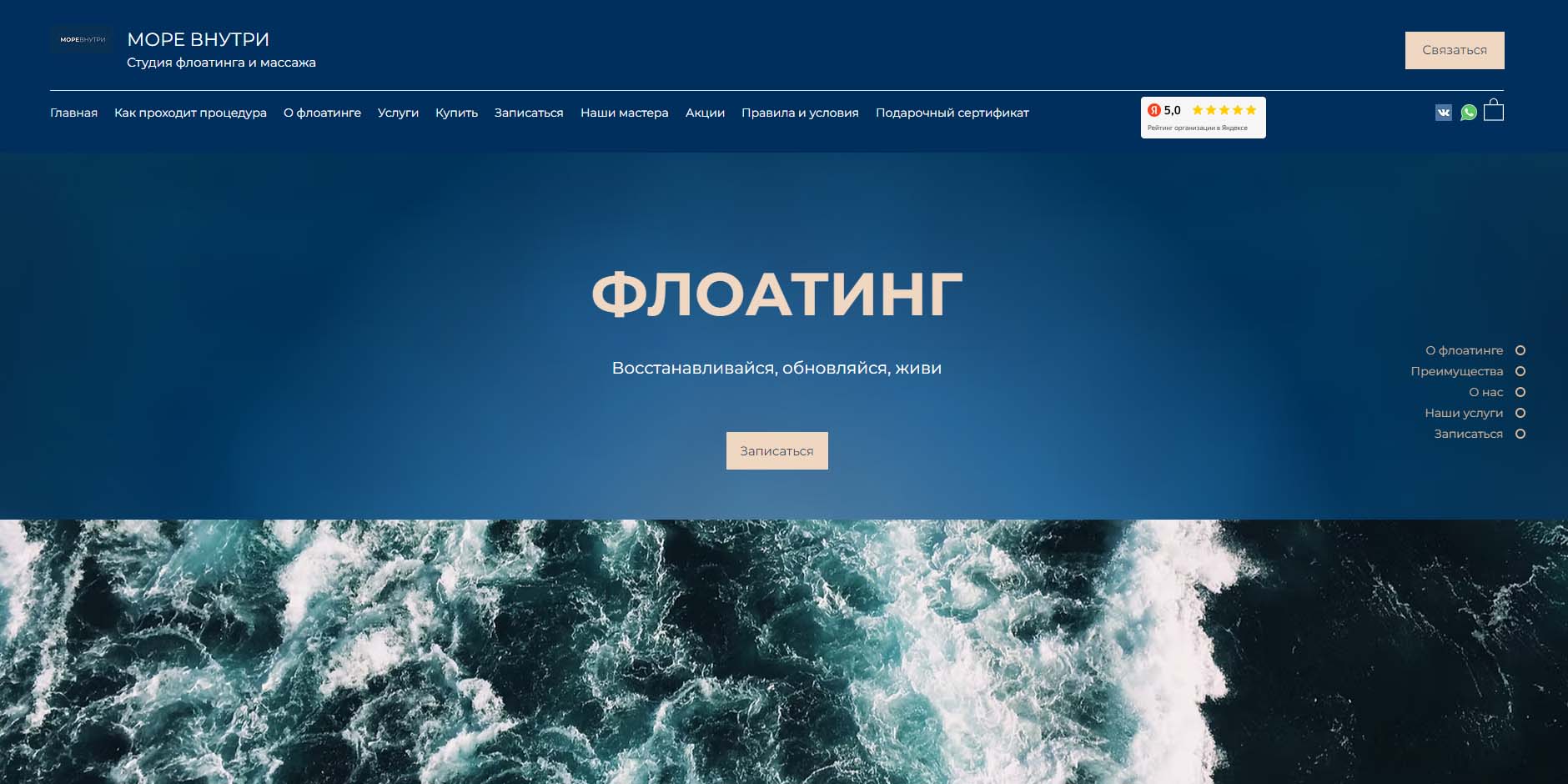 Центр формата Well-being — это новое направление в индустрии отдыха, цель которого подарить гостю опыт ненавязчивой и приятной заботы о здоровье. Есть восемь флоат-комнат. Все интерьеры очень стильные, гости отмечают приятную визуальную концепцию студии. Правда заметим, что цена услуг здесь выше средней по рынку. Флоатинг предлагают соединить с массажем и другими спа-услугами.