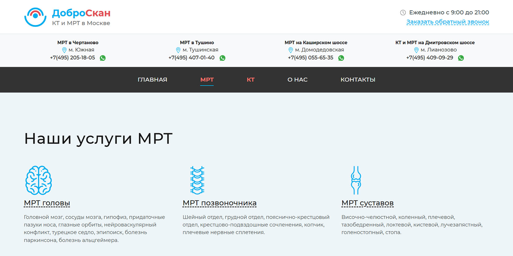 Клиника «Эксперт» в Москве ежедневно проводит МРТ-исследования любой сложности. Перечень услуг широк и включает высокоэкспертные исследования: МРТ височно-нижнечелюстного сустава, комплексные обследования, МРТ позвоночника или всего тела.