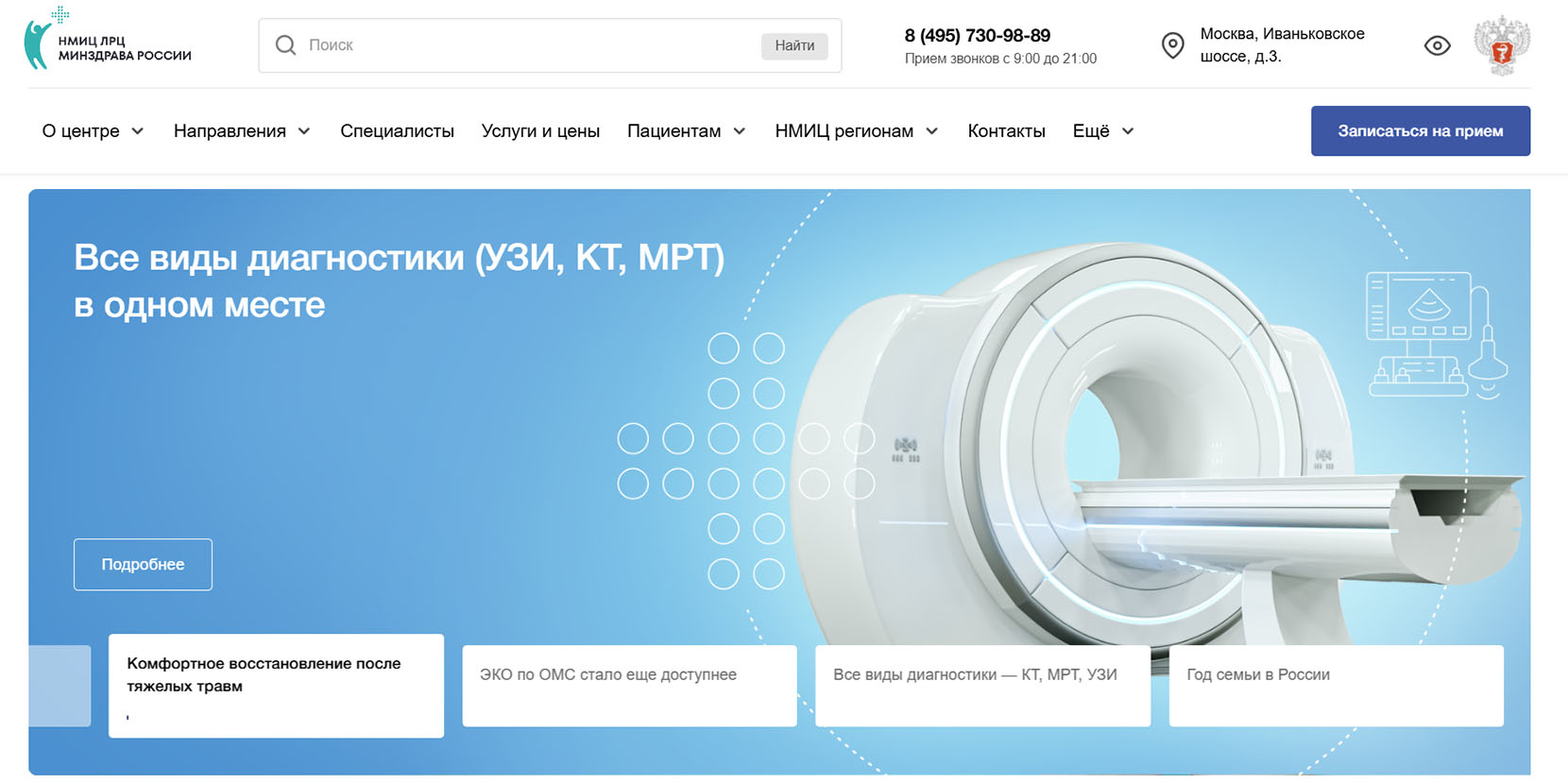 В лечебно-реабилитационном центре работают ведущие специалисты страны по более чем 30 направлениям медицинской помощи. В Центре представлен замкнутый цикл онкологической помощи, включающий диагностику, которой занимается Центр лучевой диагностики. Онкологические, кардиологические, эндокринологические, нефрологические, гематологические, пульмонологические заболевания — это далеко не полный список патологий, которые можно диагностировать здесь с помощью МРТ. В отделении установлено четыре томографа с мощностями магнитного поля 1,5 и 3 Тл.