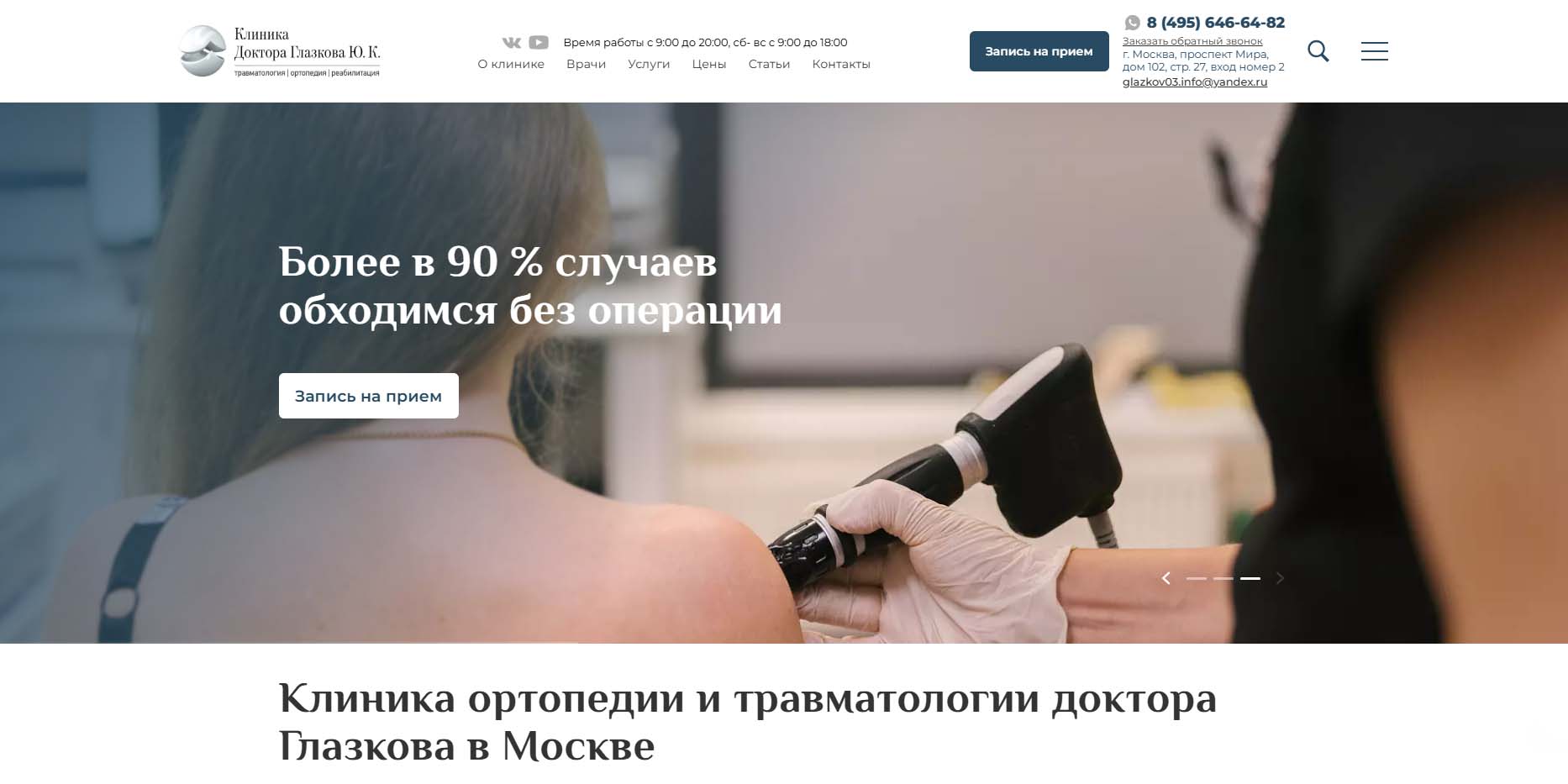 Сеть клиник безоперационного лечения суставов и позвоночника. С 2009 года отделение ортопедии-травматологии является ведущим в клинике. Среди методов лечения — SVF-терапия, методика безоперационного лечения суставов за счет использования ресурсов собственных клеток пациента. Данная терапия показана при травмах и заболеваниях крупных суставов, например, артрозе всех стадий. Также применяются внутримышечные и внутривенные инъекции, внутрисуставные уколы, мануальная терапия, лечебный массаж, плазмотерапия и многое другое. Активно перенимают опыт зарубежных коллег в области реабилитации, опираются на принципы европейской, в частности, немецкой медицины.
