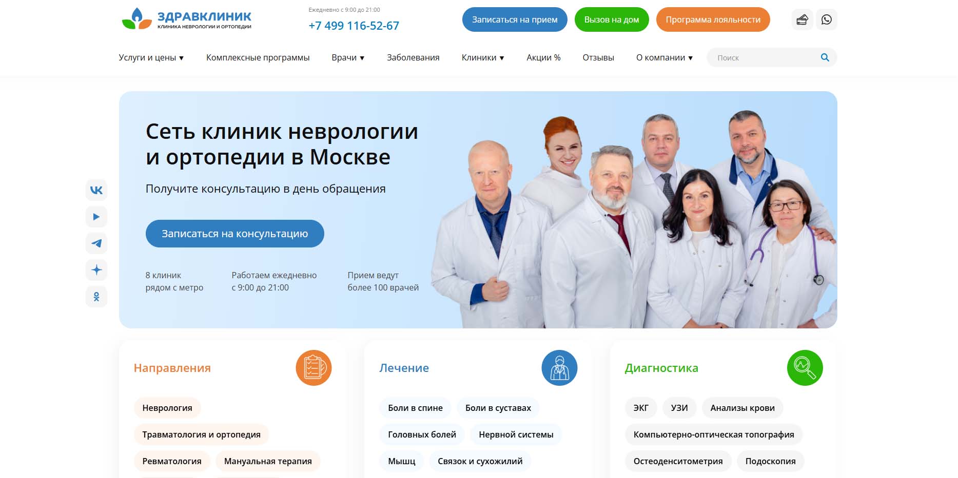 Сеть клиник в Москве более 15 лет оказывает услуги по профилю неврологии и ортопедии. Восемь филиалов расположены в шаговой доступности от станций метро. В клинику обращаются с проблемами позвоночника и суставов, заболеваниями нервной системы, чтобы восстановиться после травм и исправить осанку. Лечение болей в суставах проводится по утвержденному клиническому протоколу, состоящему из трех этапов: купирование болевого синдрома и воспалительного процесса, восстановление питания тканей сустава и улучшение микроциркуляции, стимуляция регенерации тканей. Возможен выезд врачей на дом для обследования и срочного снятия болевого синдрома. Специалисты прибывают на вызов в течение 3 часов с момента обращения.