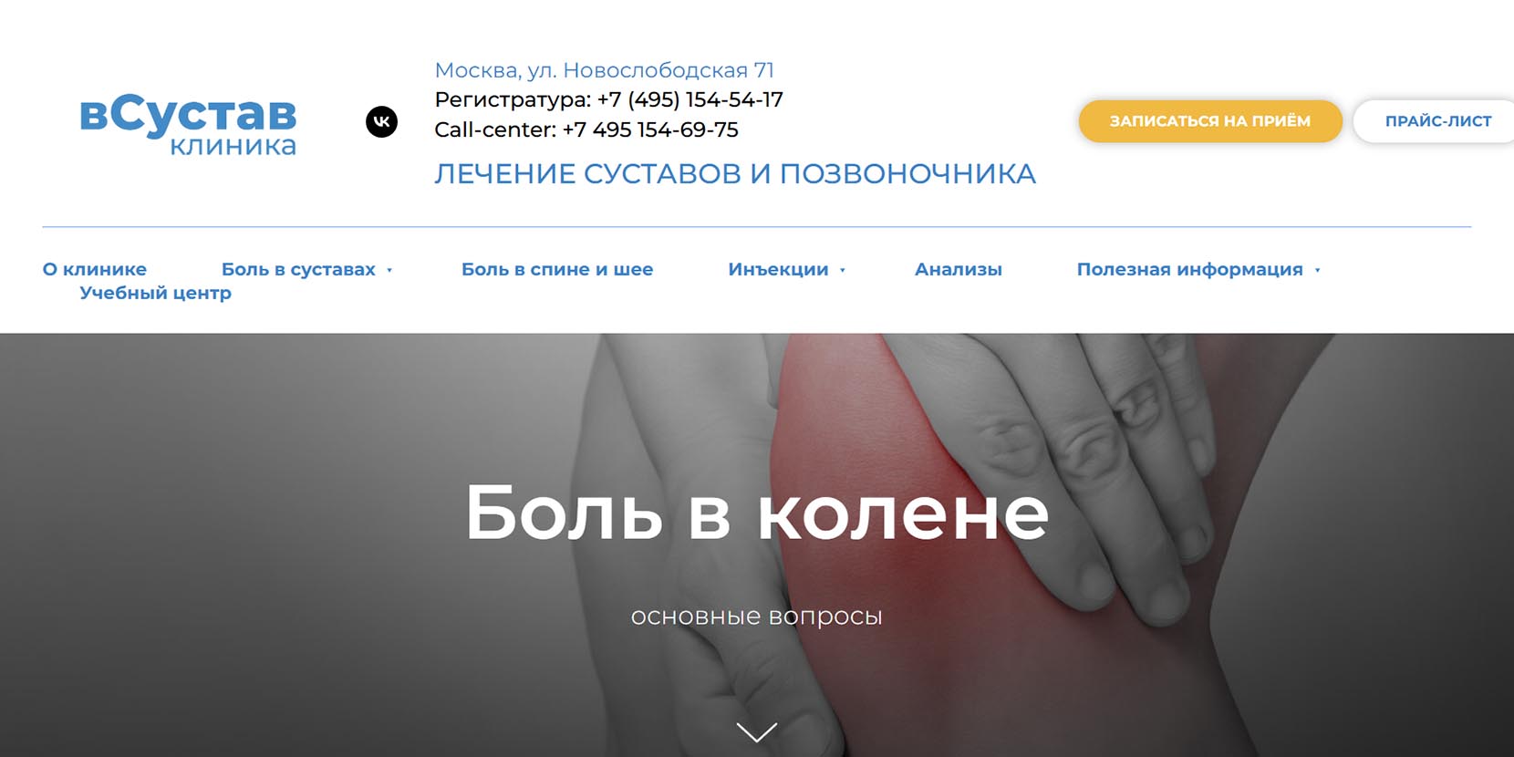 Специализированная клиника неоперативных методик лечения суставов, а также заболеваний и патологических состояний опорно-двигательного аппарата. Работают ежедневно, кроме воскресенья, без очередей, но с предварительной записью. Основной метод лечения — локальная инъекционная терапия любого уровня сложности с использованием широкого ассортимента современных препаратов. Все процедуры назначаются после обследования и УЗИ. Ведущие специалисты клиники имеют стаж работы около 20 лет и научные степени в области медицинских наук.