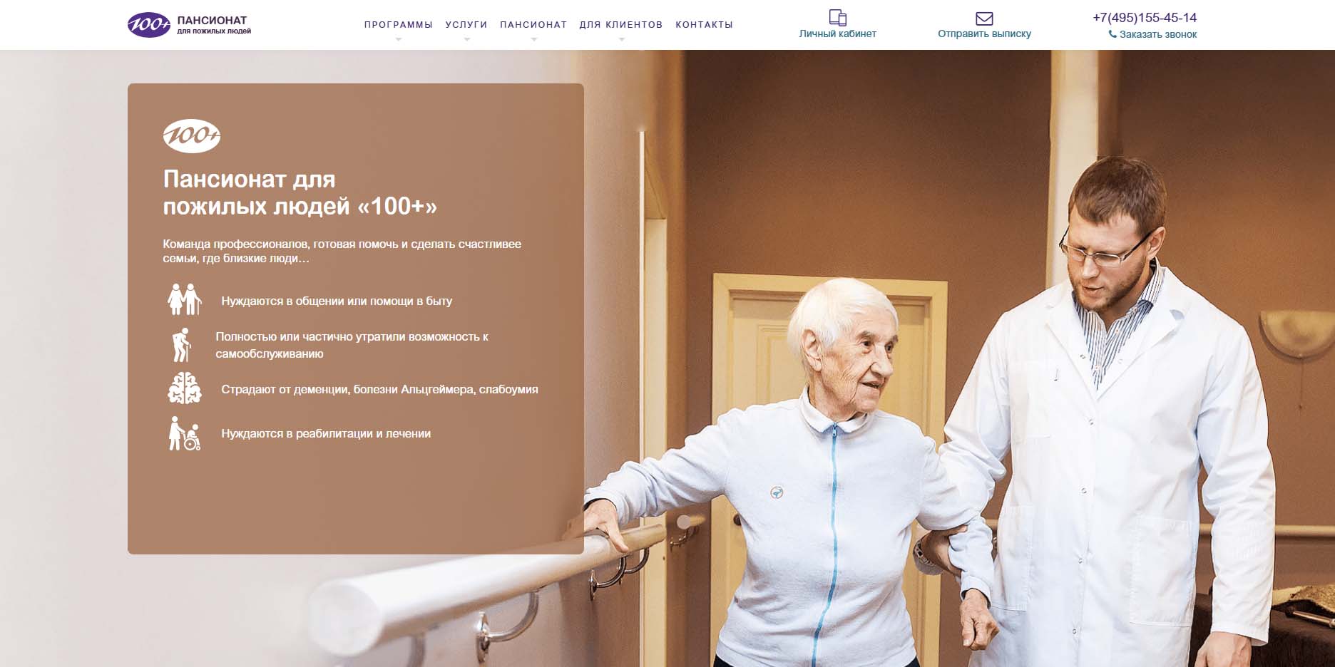 В пансионатах для пожилых «Время Жизни» помогают семьям заботиться о самых близких. Патронаж и присмотр за пожилыми людьми с диагнозами деменция, Альцгеймер, Паркинсон, уход после травм, помощь в восстановлении после перенесенных заболеваний (инсульта, инфаркта и др.) обеспечивает профессиональный персонал. Всем гостям доступно полное медицинское сопровождение.