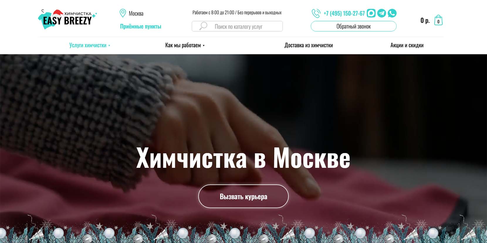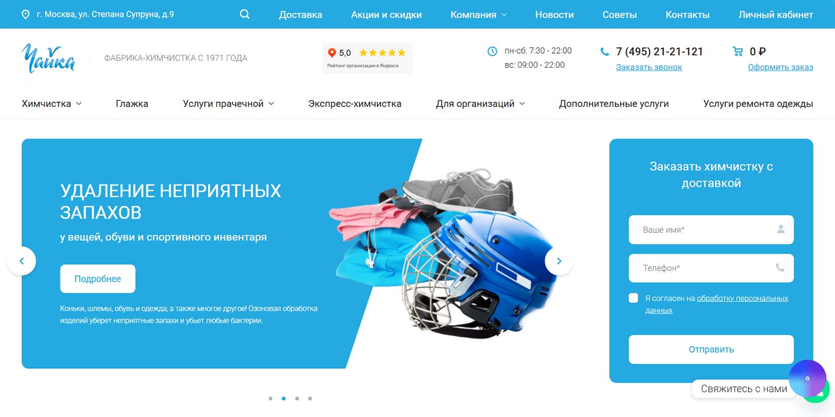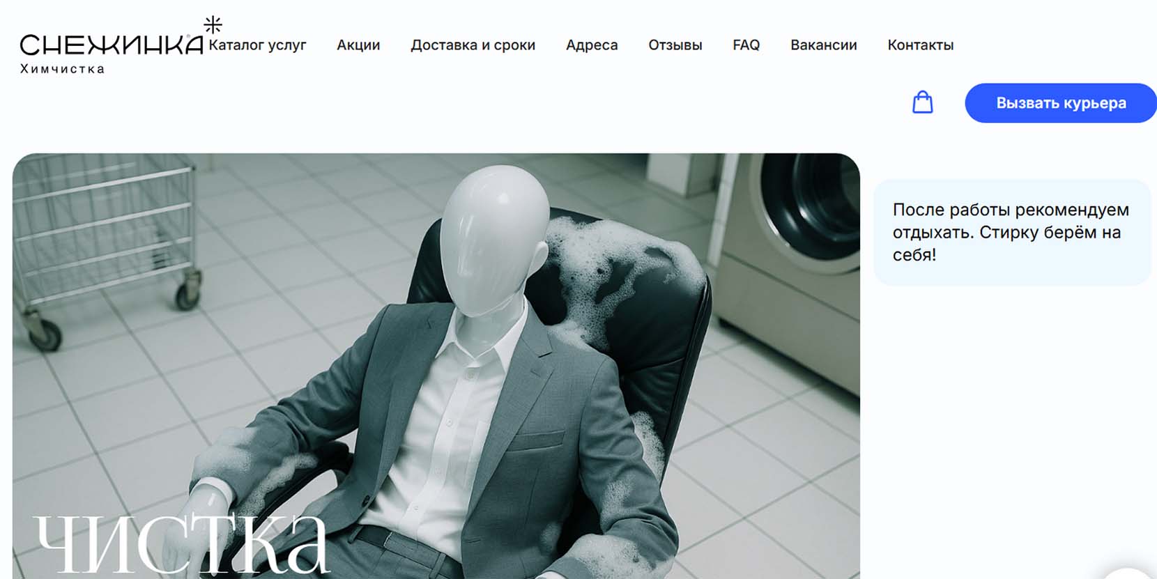 У фирмы, основанной в 2020 году, под два десятка пунктов приема по Москве и в ближайшем Подмосковье. Есть также экспресс решения с чисткой от двух часов. Практикуют курьерскую отправку/доставку. Кроме одежды чистят детские коляски, автокресла, аксессуары и спецэкипировку, например, мотоциклетную.