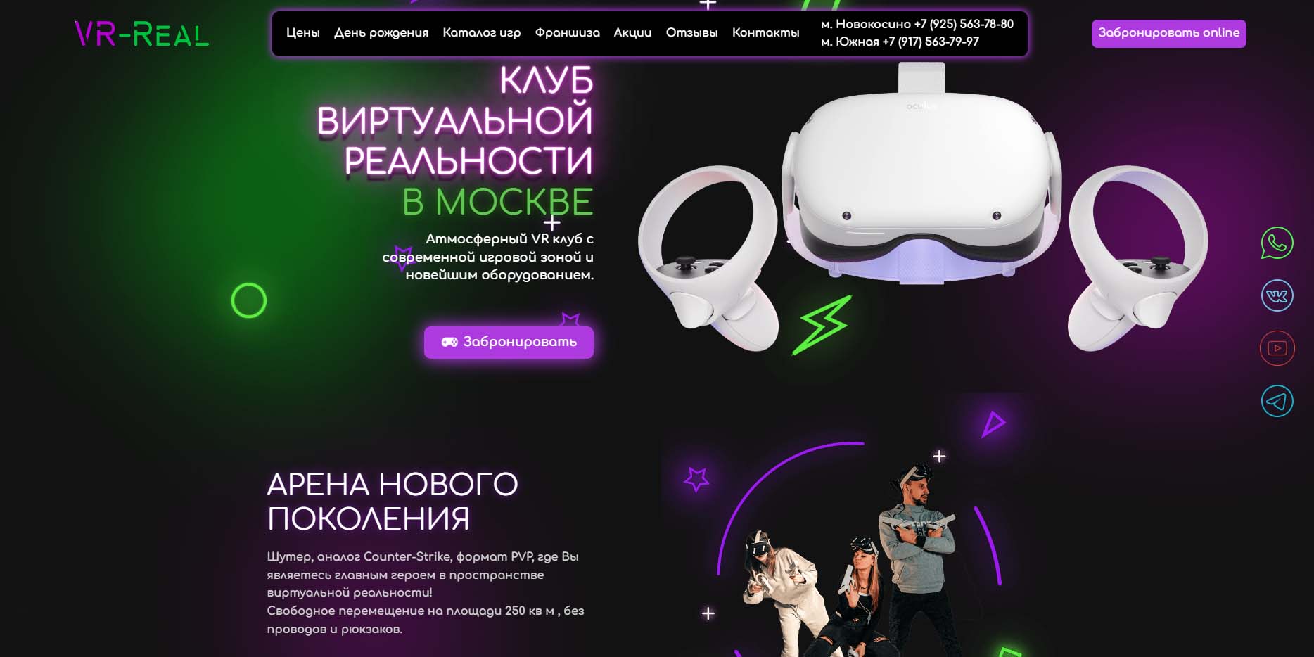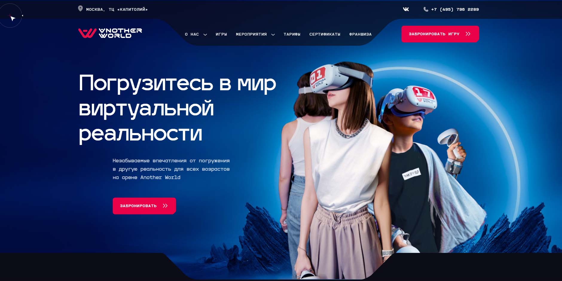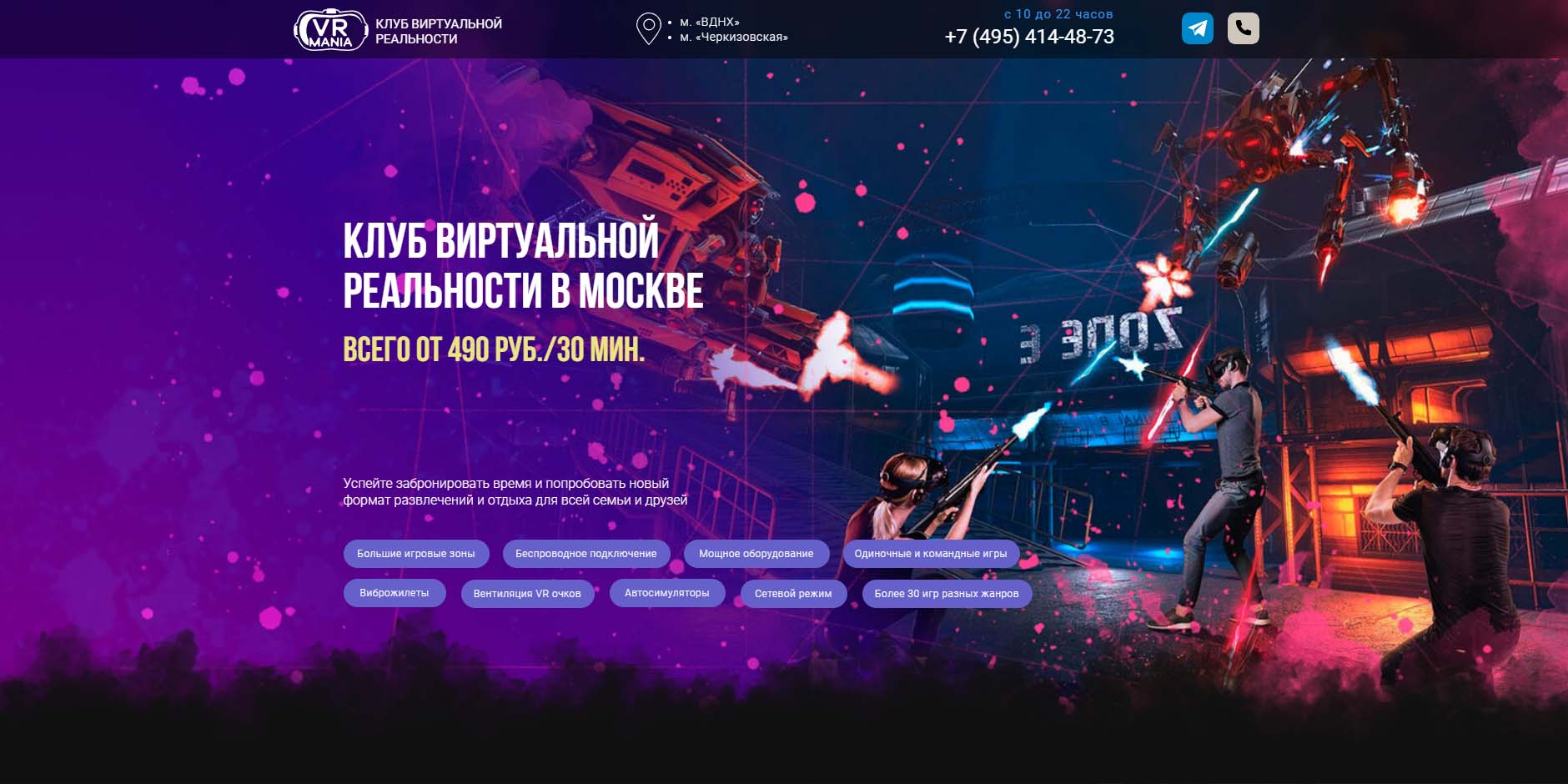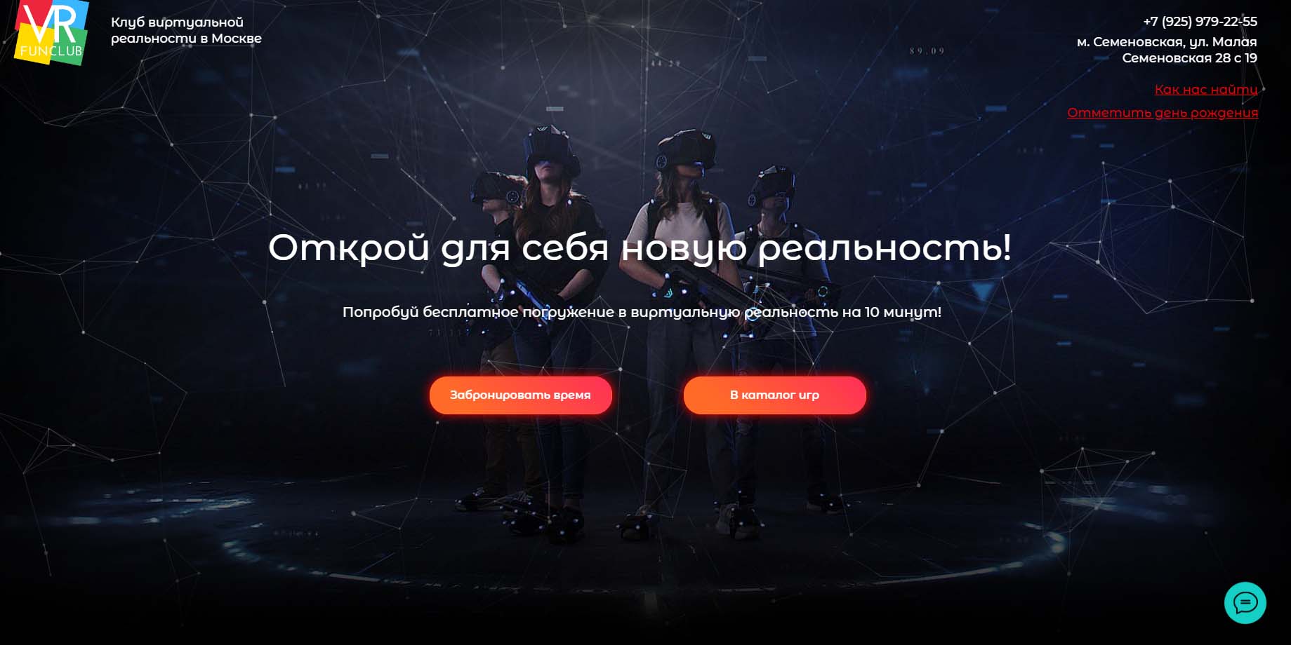 В Москве работает 3 VR-клуба этой сети. Можно поиграть даже ночью, так как работают круглосуточно. Предварительная запись обязательна. Предлагают как одиночные, так и командные игры, форматы PvP и Co-op. Есть различные аркады, шутеры, симуляторы и квесты. VR-клуб можно арендовать на день рождения или корпоратив. Здесь готовы принять кампанию от 12 до 50 человек.