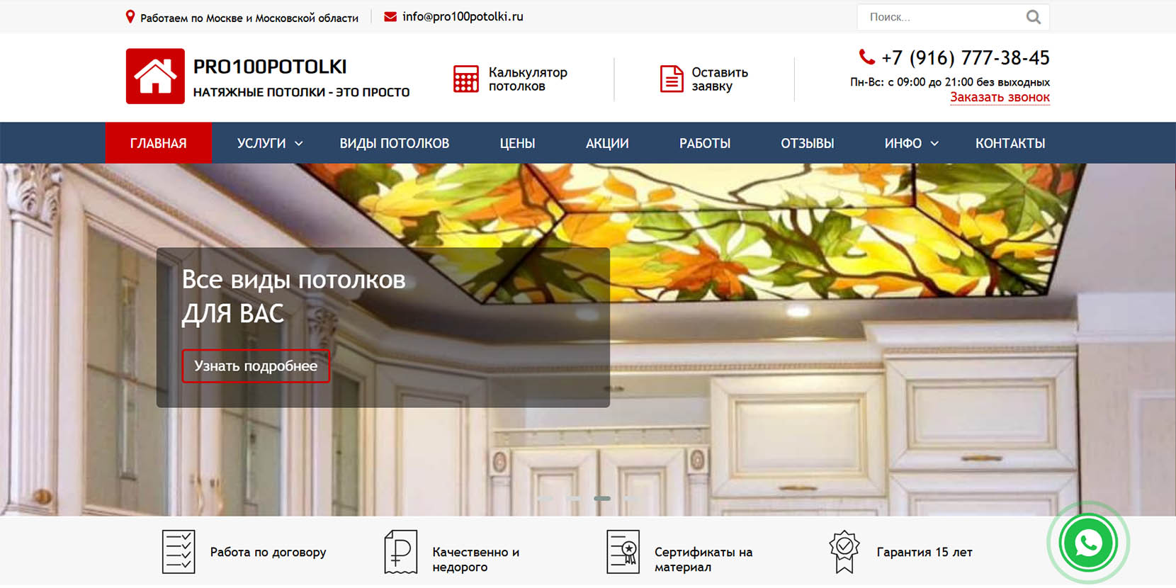Компания работает в Москве и Московской области с 2013 года, занимается производством потолочных конструкций, а также специализируется на их монтаже. Заявки принимает круглосуточно и без выходных. Клиенты могут рассчитать предварительную стоимость установки потолка и воспользоваться бесплатной консультацией специалиста. В компании создан специальный отдел проверки качества выполненных работ.