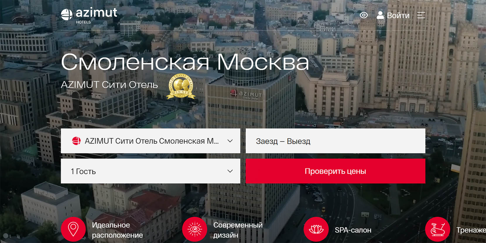 Вообще «Азимут» считается демократичным сегментом. Не прям бюджетный отдых, а скажем так — достойный средний класс. Но эта гостиница позиционирует себя как бизнес-уровень. Ее открыли в реконструированном здании бывшего отеля «Белград» рядом с Арбатом. На территории много общепита (бельгийский паб, рестораны международной и сибирской кухни и другие), доступные общественные зоны для работы и отдыха. На последних этажах размещен фитнес-центр и спа.