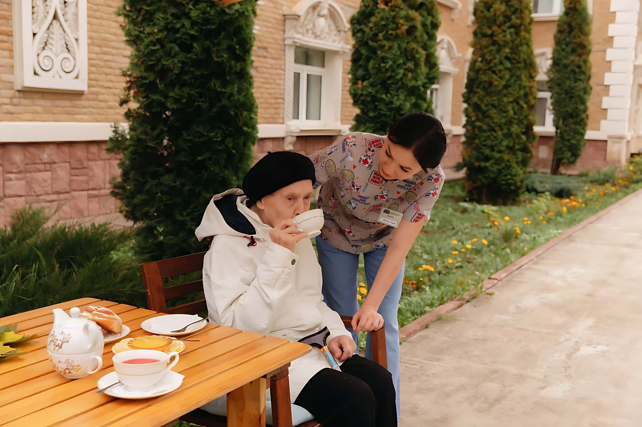 Каждого гостя сопровождает личная сиделка. Она следит за соблюдением режима, напоминает о приеме лекарств и времени посещения процедур. Круглосуточно в пансионате находится опытный персонал — управляющая, медсестры, сиделки, горничные, повара. Они готовы оказать помощь в любой момент. Постояльцев окружают заботой и вниманием, размещают в уютных номерах, где созданы комфортные условия, есть поручни, пандусы, функциональные кровати.
