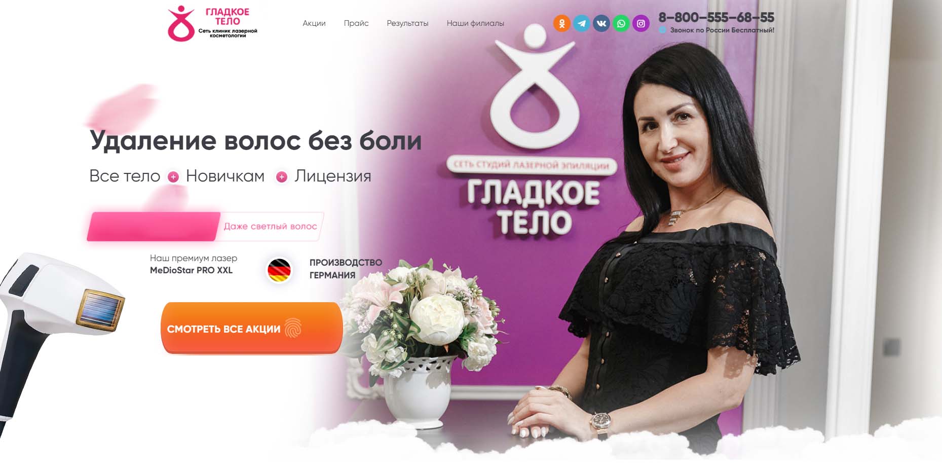 Сеть клиник специализируется на профессиональной лазерной эпиляции. Здесь используется немецкий лазер. Он позволяет практически безболезненно удалять волосы на всех участках тела и сохранять результат на длительный срок. Все процедуры выполняются косметологами с медицинским образованием, которые индивидуально подбирают режим работы аппарата с учетом особенностей кожи и волос.
