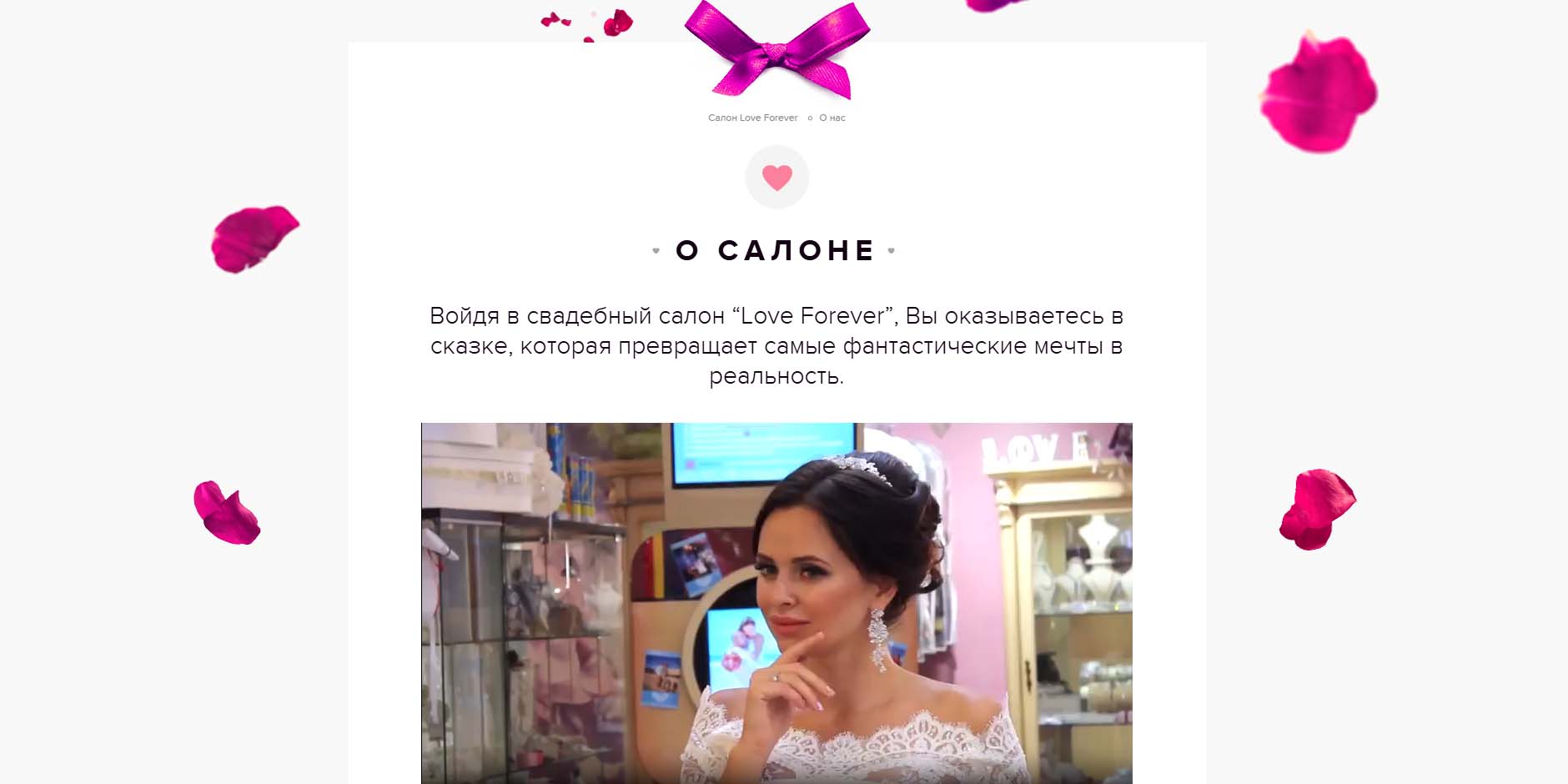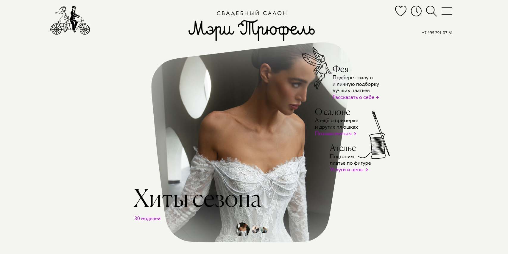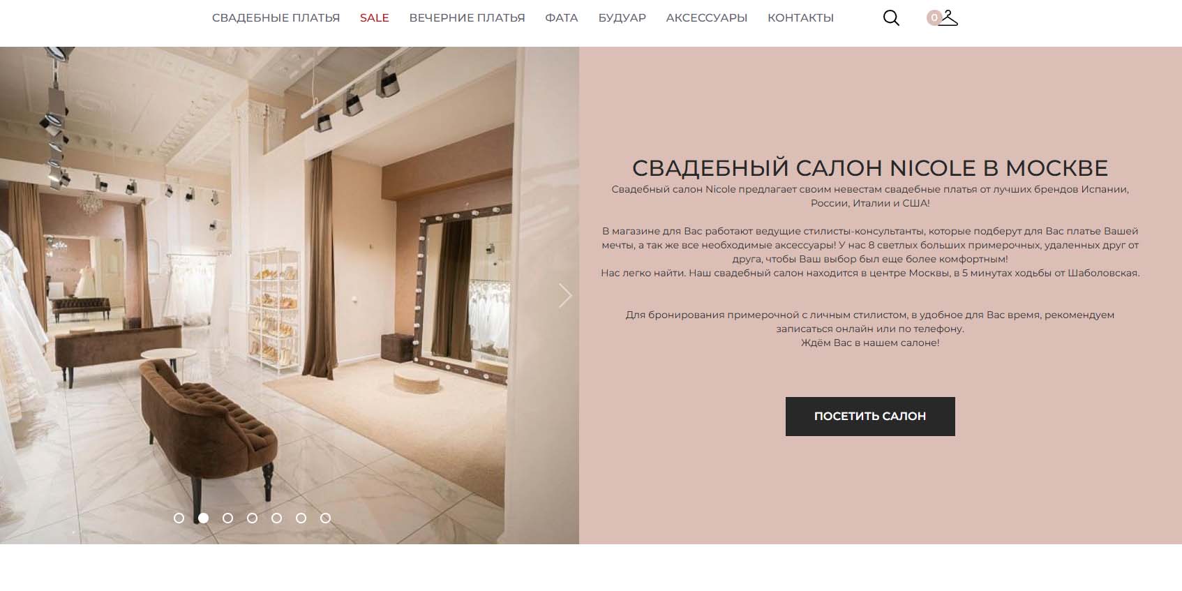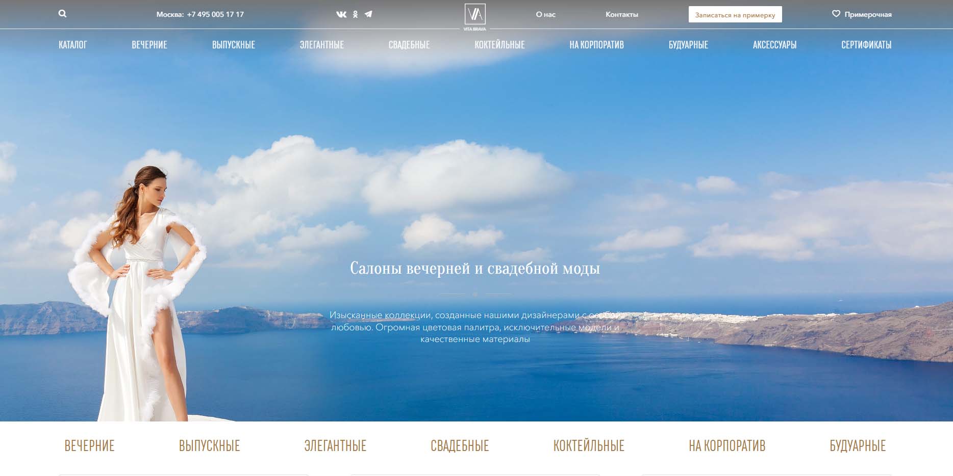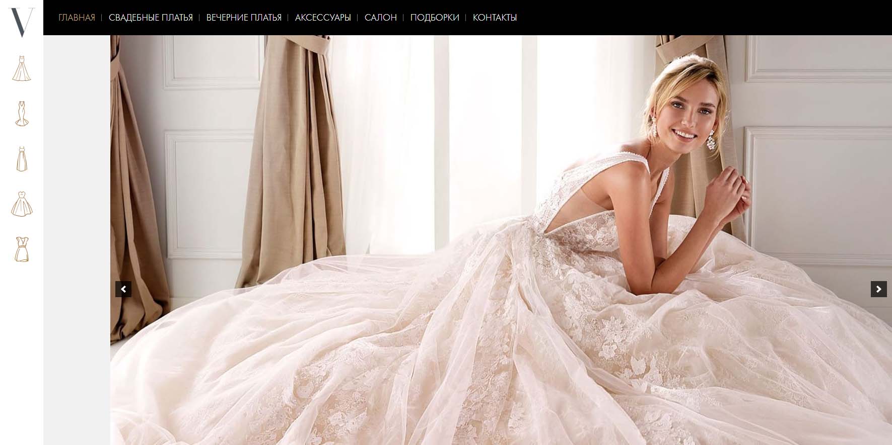 В салоне представлены свадебные платья от известных дизайнеров. Здесь вам помогут выбрать наряд, подогнать его по фигуре, предложат оставить его на хранение до свадьбы и полностью подготовят к торжеству. Есть услуги онлайн-примерки: невеста пришлет свое фото, мерки и перечень приглянувшихся моделей, а консультанты по видеосвязи расскажут о нюансах посадки платья и продемонстрируют на манекене.