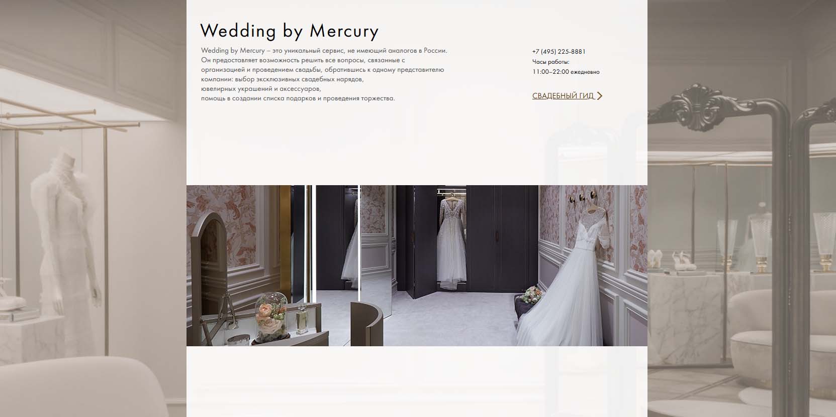 Салон располагается в историческом центре Москвы и примерка платья тут буквально погружает невесту в историю, несколько напоминая посещение светского дворянского салона. Во всяком случае лепнина на стенах и интересные зеркала отсылают ко временам дореволюционной России. В бутике подчеркивают, что не сотрудничают с фабриками, ориентированными на массовый пошив нарядов, — только с дизайнерами, причем как признанными в международном масштабе, так и восходящими звездами в мире свадебной моды. Здесь можно выбрать платье из лимитированных коллекций модельеров, а также достойные аксессуары.