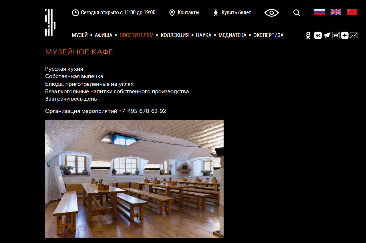 Кафе при музее Андрея Рублева на территории Спасо-Андроникова монастыря. Умиротворенное местечко с приятным интерьером. Жаль, что в меню доминирует европейская кухня: пицца и пасты. Хотя можно найти и современные оммажи к русскому столу. Например, щи с копченостями или полба с пармезаном. Рекомендуем сходить сюда теплым летним днем и отобедать на улице.