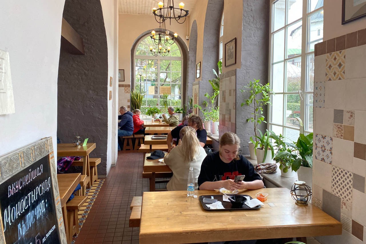 Однозначно, это самый красивый обеденный зал. С расписных стен на обедающих взирают святые угодники. Трапезная находится в подклете (т.е. цоколе) Сергиевского храма. Блюда также преимущественно постные — классика русской кухни. Борщи, щи, рассольник, вареники с овощами, пельмени с рыбой. Приходить лучше в первой половине дня, ибо к четырем-пяти вечера ассортимент заметно скудеет — едоков хватает. Домой можно прикупить свежий монастырский хлеб на закваске.
