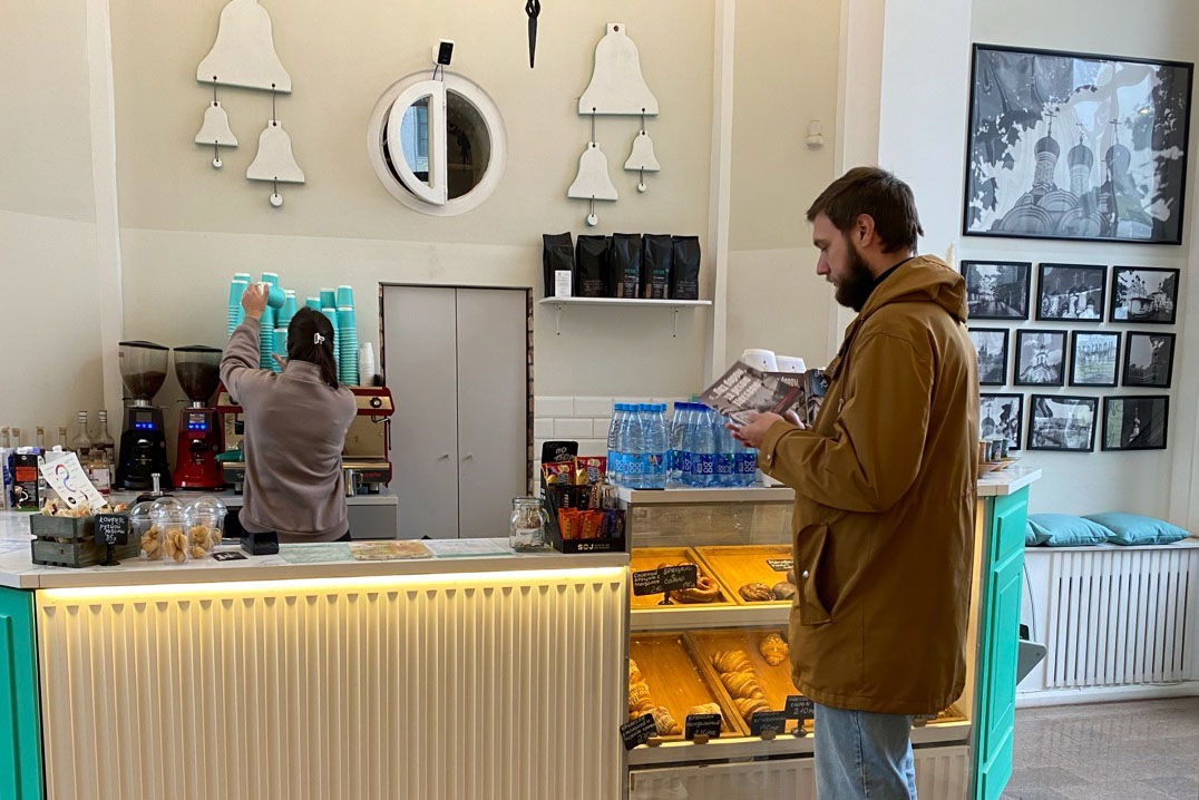 Меню — отрада сладкоежек. Но весь ассортимент сдобы закупают у поставщиков. Кофейная карта должна понравиться фанатам горячих напитков со всякими сиропами. В зале библиотека христианской литературы: с интересом почитали позднесоветский семинарский учебник, в котором растолковывалась разница церковных таинств различных ветвей христианства.
