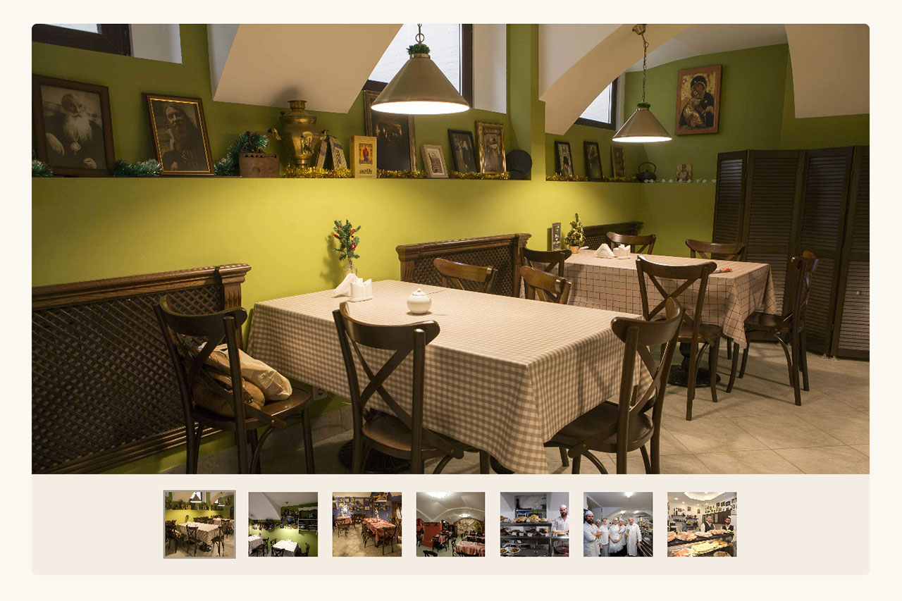 Очень большой ассортимент блюд, хотя и без «постных специалитетов». Много запеченных овощей, всегда три-четыре гарнира и приличный выбор выпечки.В зале поют живые канарейки. Место людное. Сюда хорошо зайти после осмотра вотчины старообрядцев (только одевайтесь построже!).