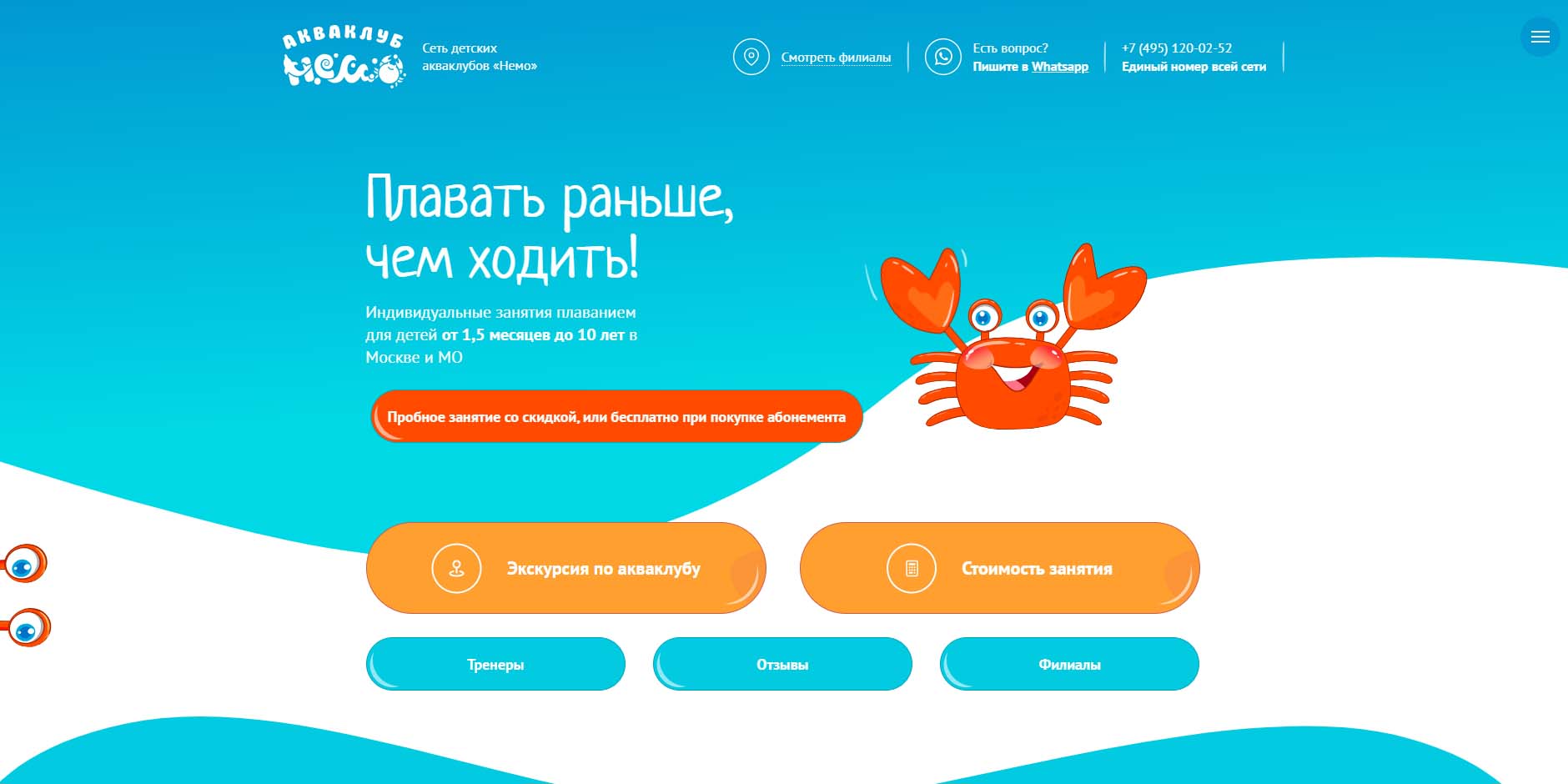 Научить плавать раньше, чем ходить — такова задача инструкторов этой сети акваклубов. Для самых маленьких тренировки проводятся в игровой форме, чтобы было веселее. Занятия по раннему плаванию проводят для детей от 1,5 месяцев до 7 лет. Фишка клуба — компактные бассейны, где малышам спокойнее и больше внимания от тренера. Вода проходит многоступенчатую систему очистки после каждого занятия. Родители отмечают, что тренеры «Nemo» легко находят подход даже к капризным малышам.