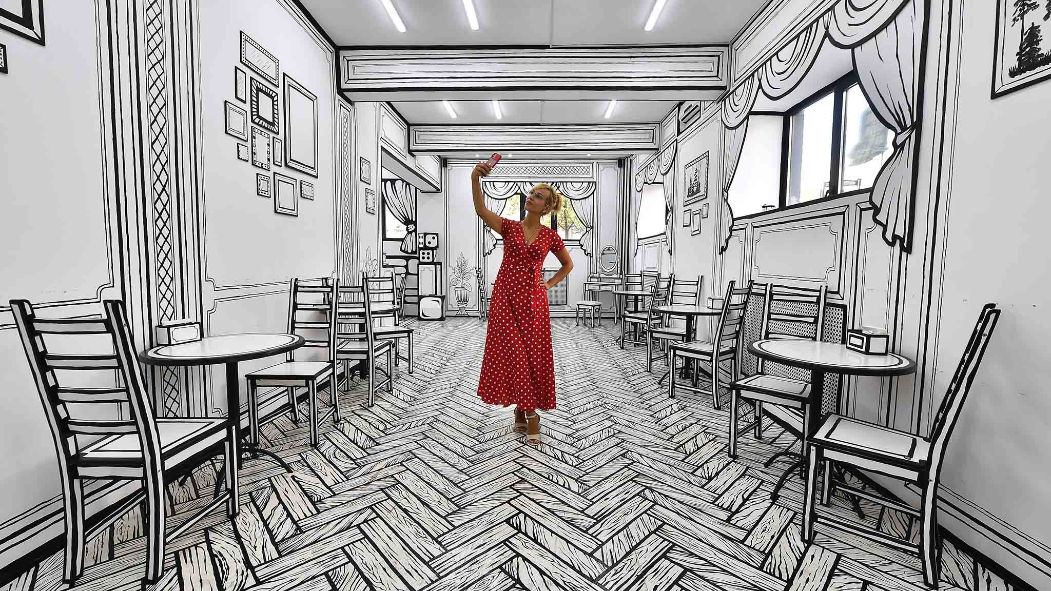 В павильоне №55 Выставочного центра размещены 3D-произведения современных художников, которые созданы специально для фотосессий. Интересно запечатлеть своих друзей плывущими на «Титанике» или получающими премию из рук президента. Вы можете сделать кадр на фоне огромных и очень дружелюбных собак, которые раз в пять больше человека, или в ярком гангстерском автомобиле. Чтобы инсталляции получились объемными, нужно правильно выбрать ракурс.