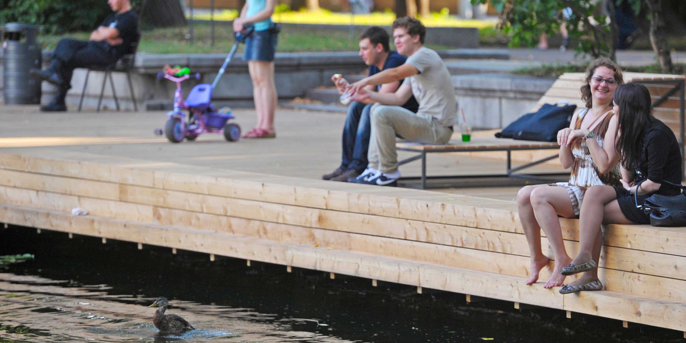 Вечером пруд освещают специальные лампы, что делает это место более романтичным.