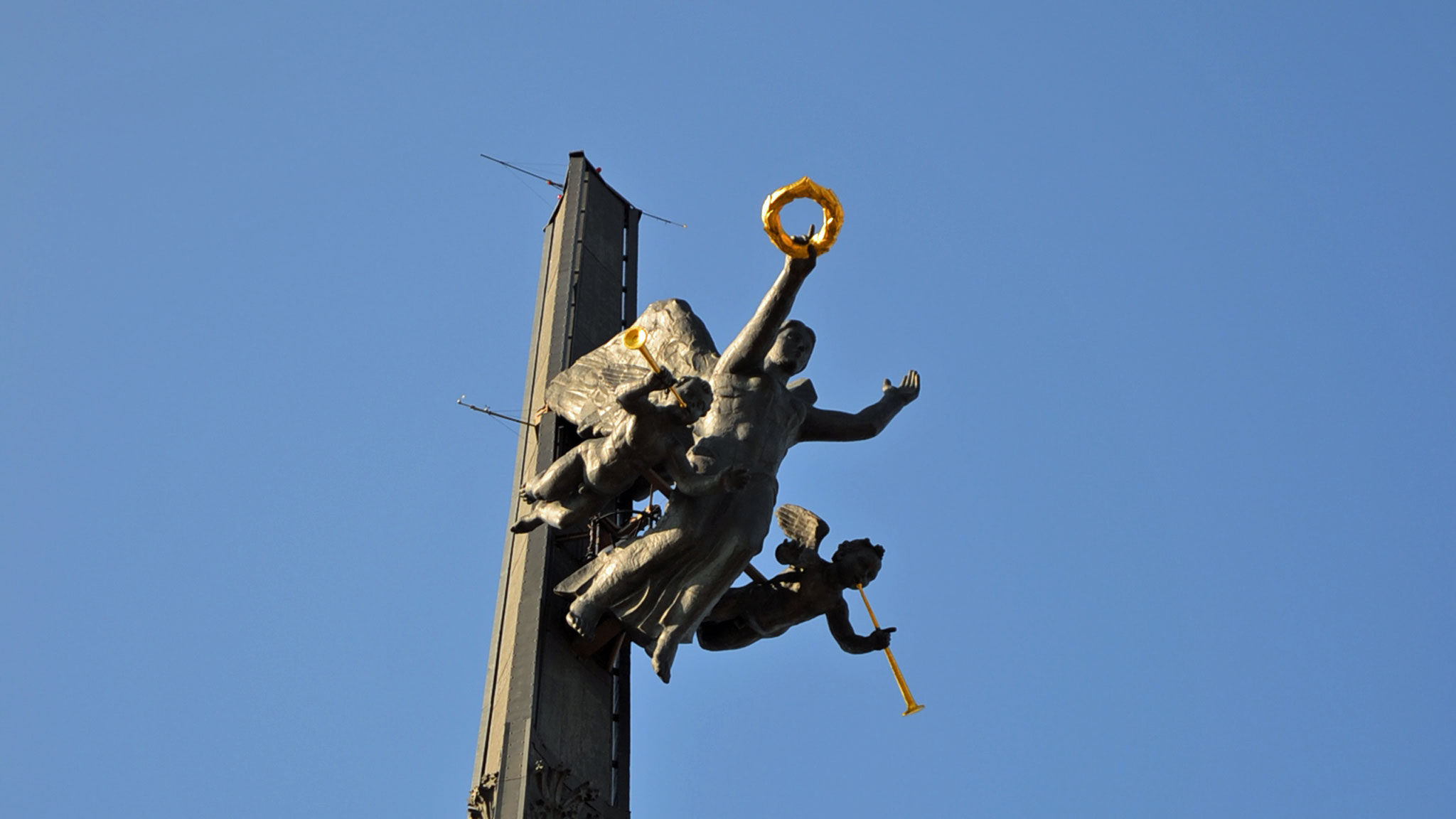 Трехгранный обелиск вонзается куда-то в облака, символизируя собой солдатский штык. Народ задирает головы, силясь вместить в окошко фотообъектива обелиск от подножья до верхушки. А на ней — Ника, богиня Победы, в окружении двух ангелов, возвещающая о том, что враг повержен.