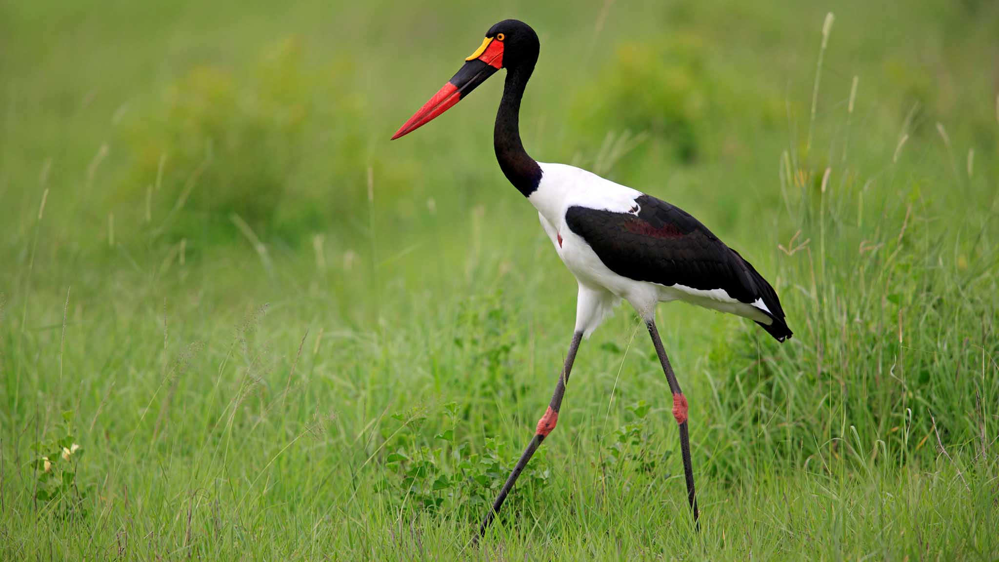 Седлоклювые ябиру — самые крупные представители семейства аистов. Самки — около 140 см, самцы — все 180 см, выше некоторых людей. Помимо роста, отличить самца от самки можно по глазам: у самца они тёмные, у самки — ярко-жёлтые. Чёрные головы и тёмные крылья сочетаются с яркими элементами на длинных клювах, белыми туловищами и удивительно подвижными ногами. Когда ябиру сидит, его колени выгибаются назад, а лапы оказываются перед головой. Звуков они, как и остальные аисты, издавать не могут, поэтому общаются при помощи щёлканья клювом.