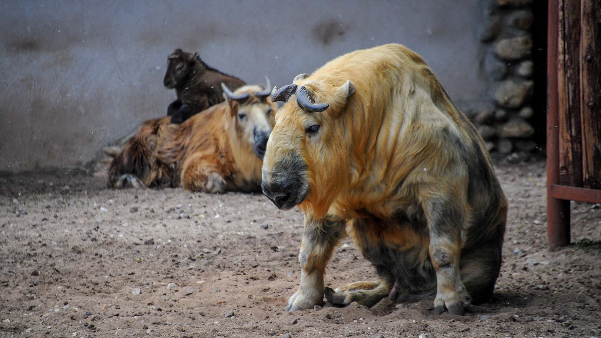 Когда впервые видишь такина, думаешь, что это какой-то небольшой пушистый бык. Однако, несмотря на сходство с крупным рогатым скотом, на самом деле этот зверь — родственник барана. В природе сычуаньские такины живут в бамбуковых лесах, как и большие панды, и точно так же они признаны национальным достоянием Китая. Питаются эти звери бамбуком, сеном и зерном, сочные овощи могут причинить им вред. Семья сычуаньских такинов проживает на Новой территории Московского зоопарка, куда 15 лет назад их привезли из зоопарка в Пекине.