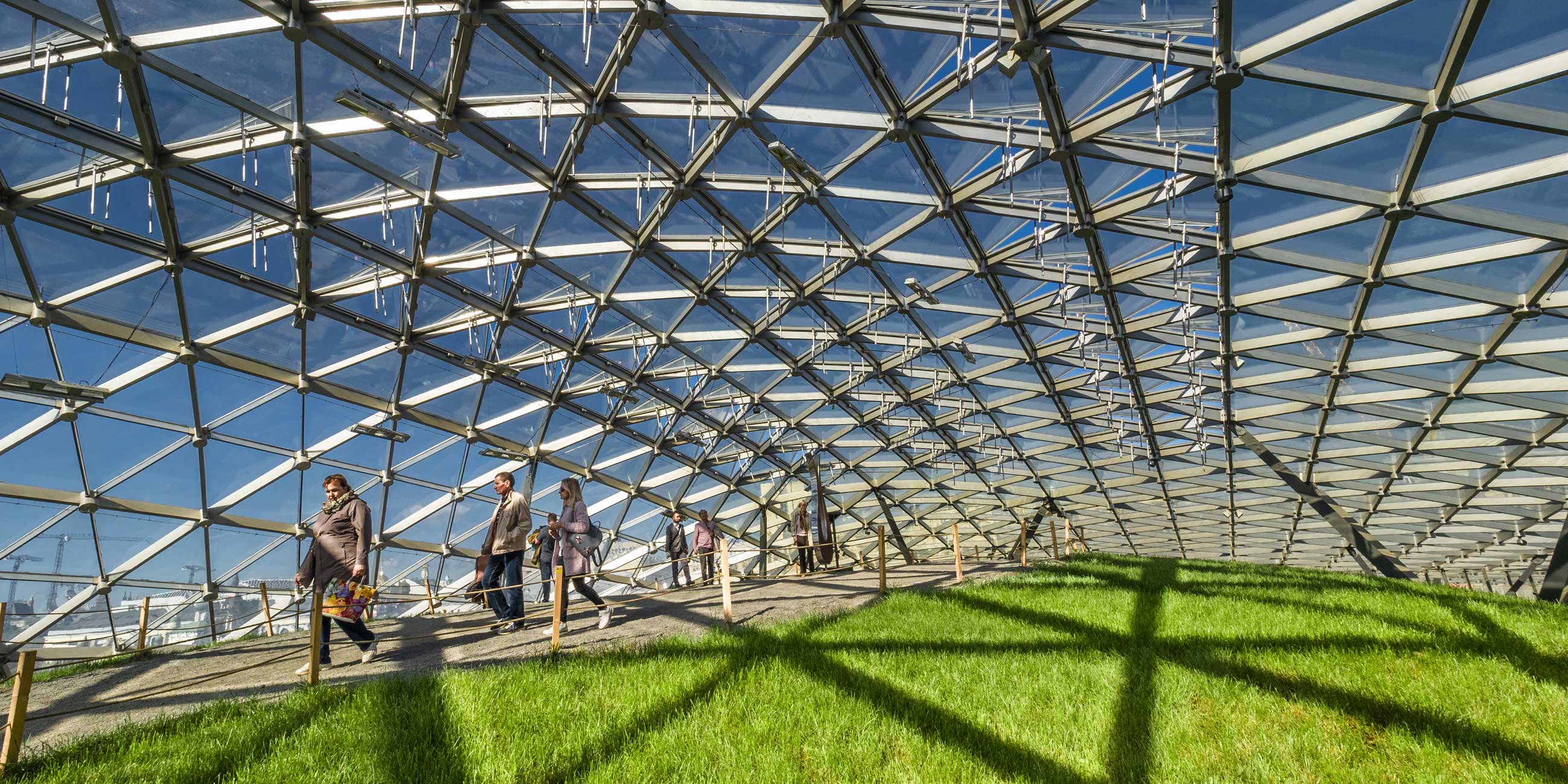 Для долгой прогулки зимой стоит утеплиться. Но и в мороз, и в дождь есть где спрятаться. Под куполом «Стеклянной коры» создан искусственный микроклимат: регулируется температура, используются технологии управления ветром. Благодаря этому там растут теплолюбивые растения, а гости парка могут согреться.