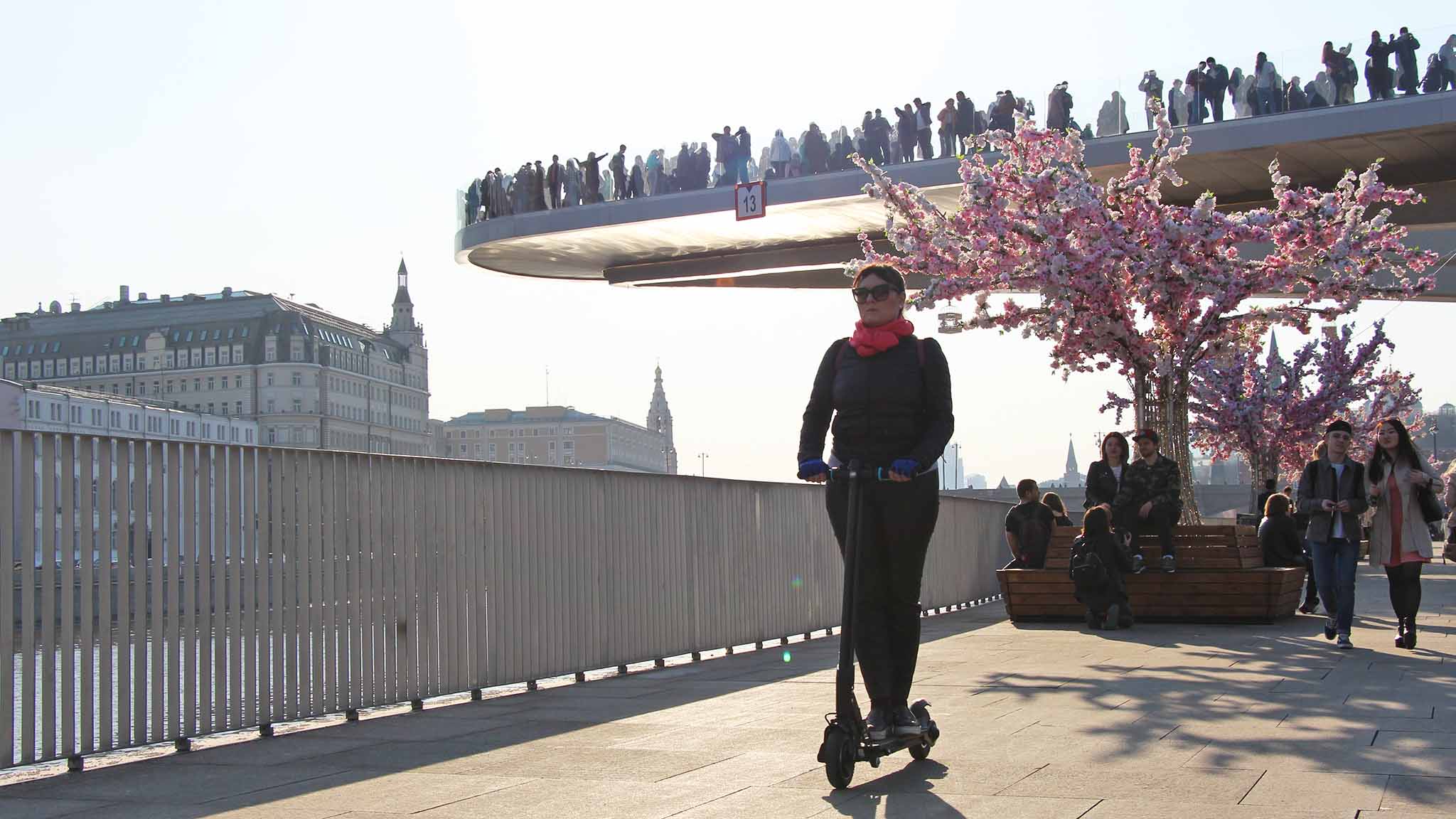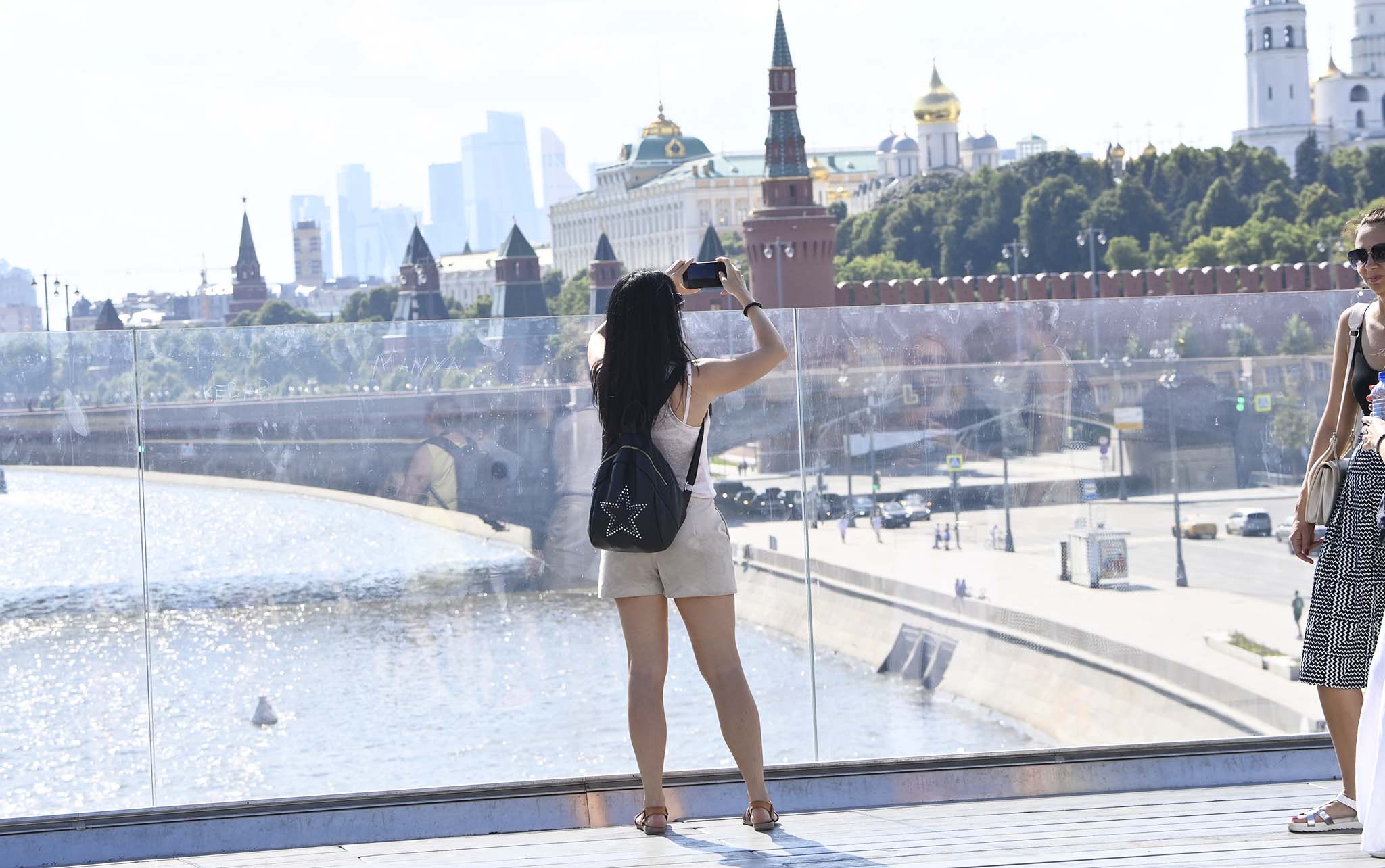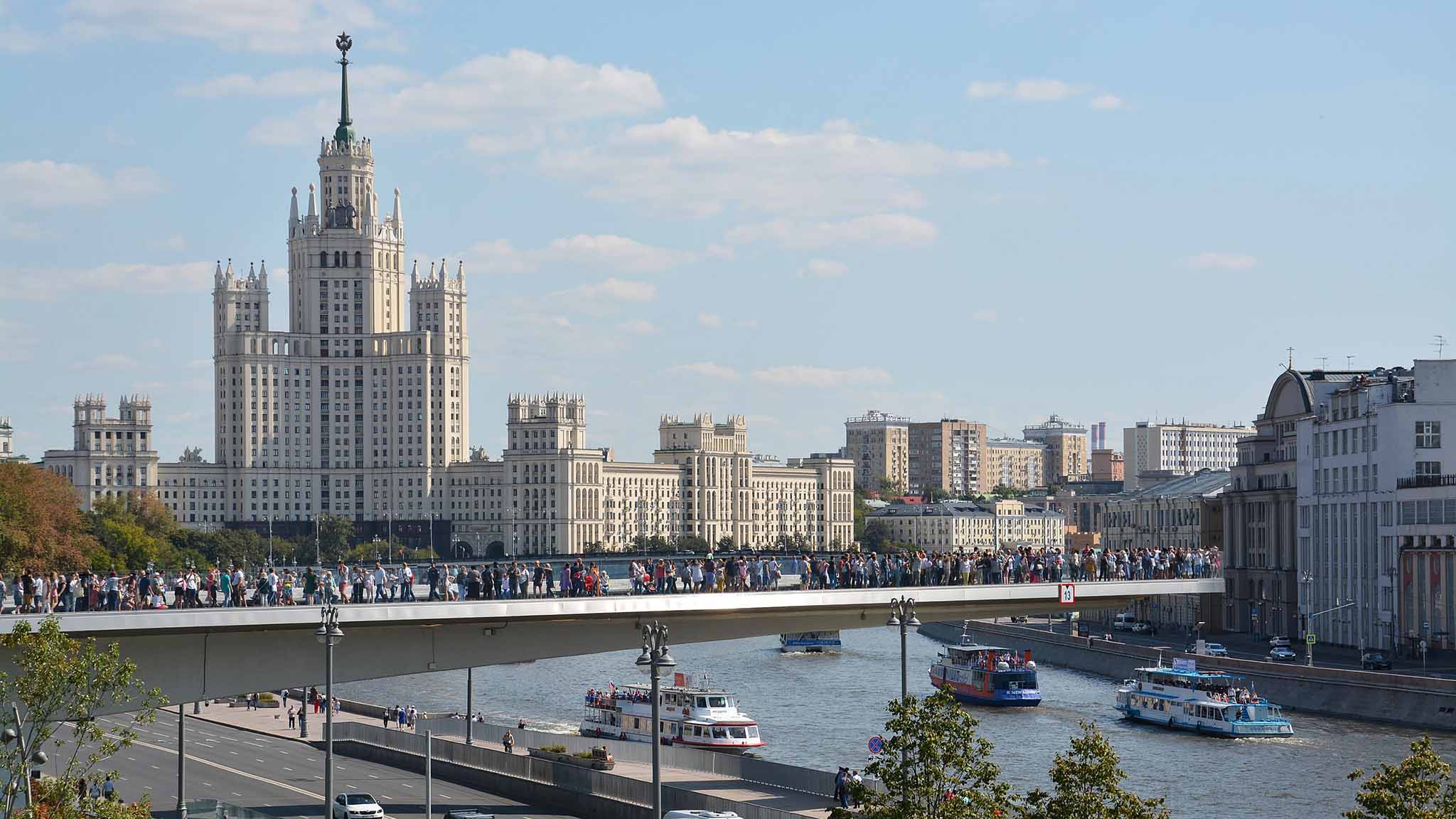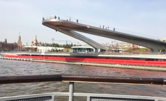 Оригинальное сооружение в форме бумеранга словно парит в воздухе, поднимаясь над рекой на 15 метров. Желающих погулять по мосту всегда хватает, потому что с него видны многие достопримечательности столицы. Выше по реке открывается панорама Большого Москворецкого моста. Рядом с ним — угловая Беклемишевская башня Кремля.