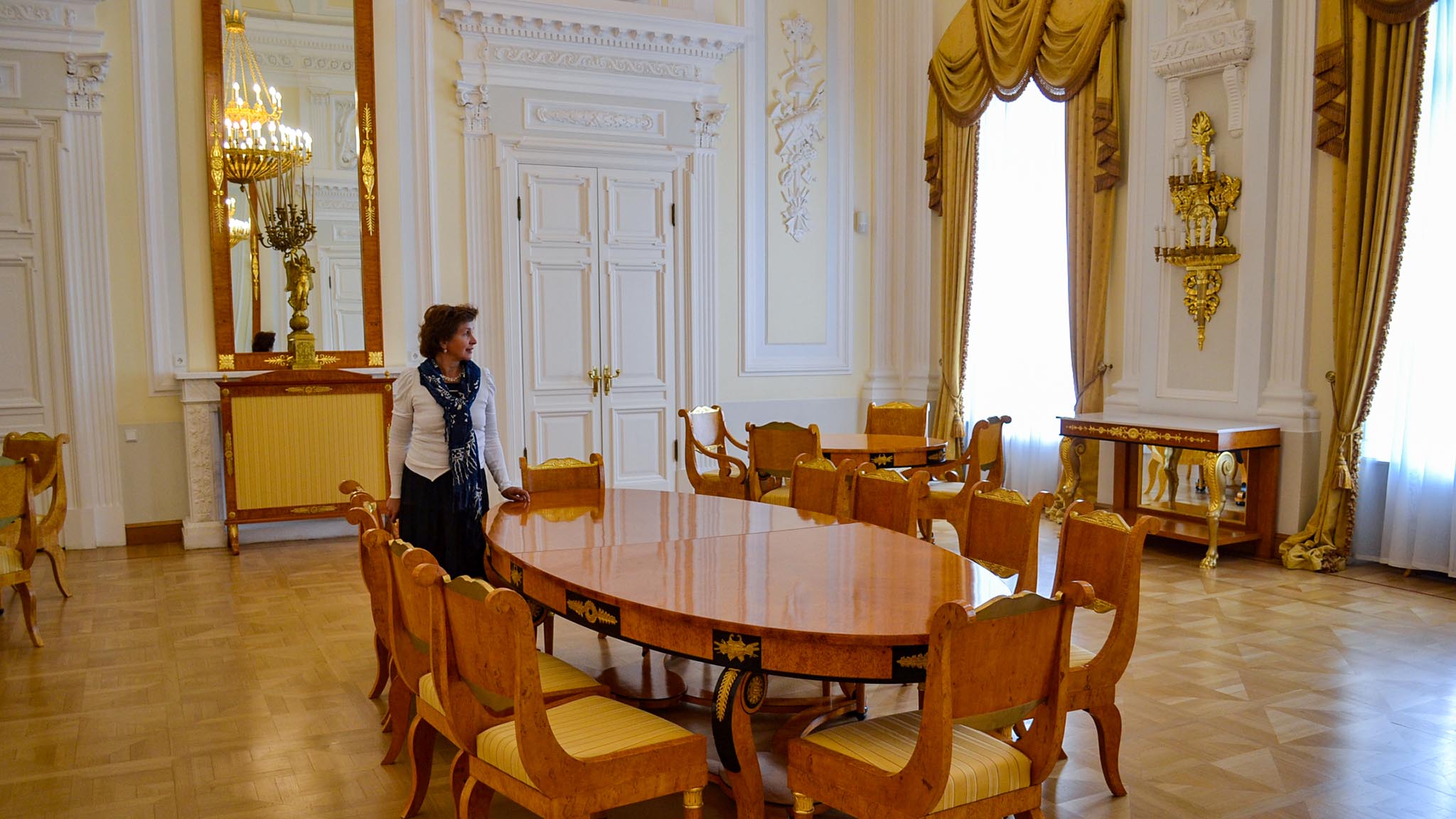 Вас проведут по всем пяти парадным залам (частные царские спальни не сохранились). В одном из них установлен макет дворца целиком. Тут же выставлены старинные шахматы, которые высокие особы брали с собой в дорогу, коротая путь из Санкт-Петербурга в Москву и обратно. На стенах горят лампочки заостренной формы, и свет их дрожит на стенах и зеркалах, имитируя отблеск настоящих свечей.