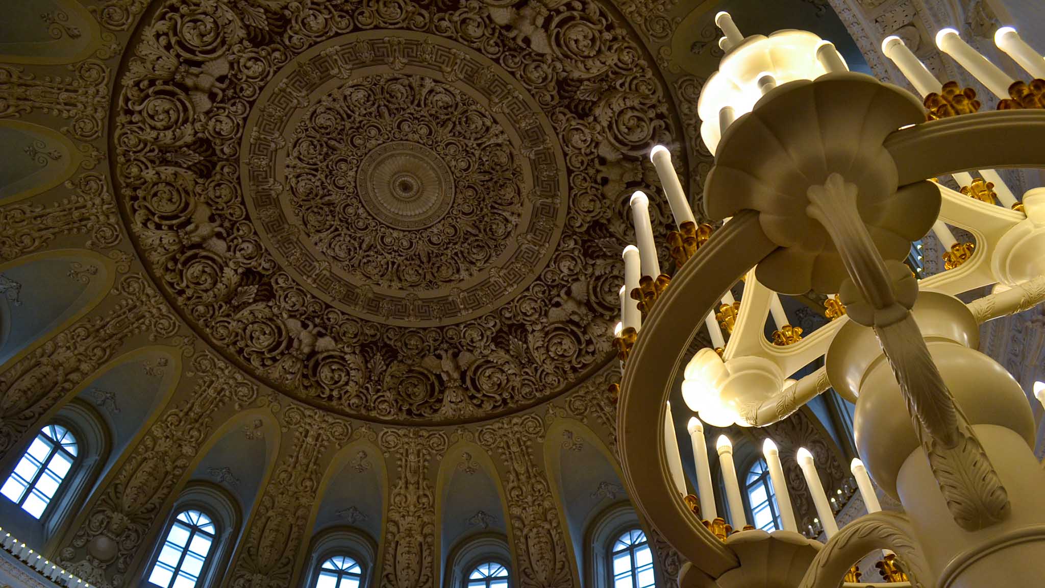 Главный зал расположен под куполом, который венчает дворец. По всей окружности купол изнутри украшает гризайль — роспись, имитирующая объем (внизу кажется, что это лепнина). Изображены вазы с цветами, стебли и листья, которые визуально превращаются в лиры. Узкие стрельчатые окошки, по образу и подобию готических церквей, рассеивают по залу потоки света. Старожилы Москвы вспоминают: в бытность летной академии тут, прямо под куполом, висел самолет!
