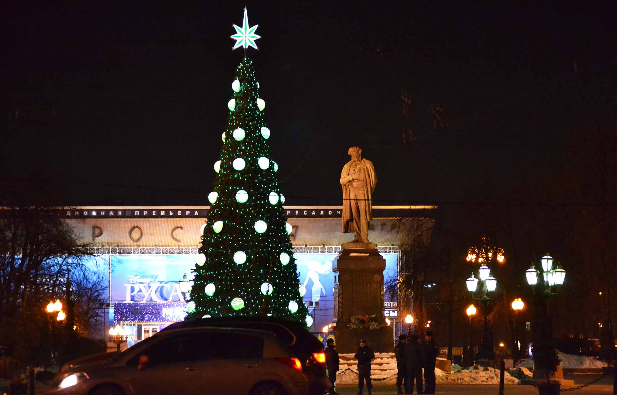 В 1961-м на площади открыли кинотеатр «Россия», который в 90-е переименовали в «Пушкинский». Почему – доподлинно неизвестно. Может, потому, что в народе ходила шутка — мол, Пушкин повернулся задом к России. Однако в нашем веке название вернули, сейчас здесь находится театр «Россия».