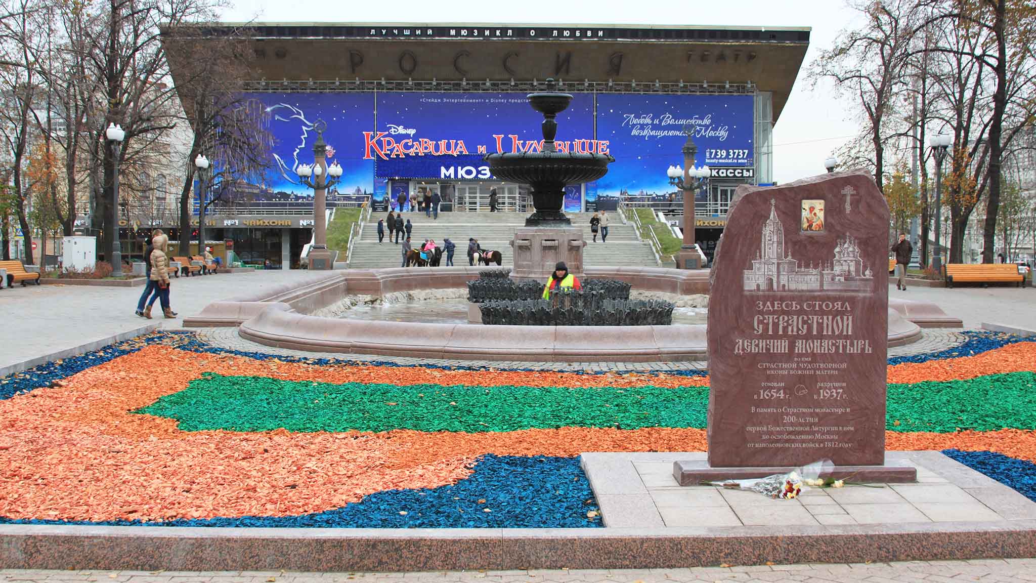 На месте нынешней площади в 1654 году был основан Страстной монастырь. Название – в честь Страстной иконы Божьей матери, у которой, по легенде, исцелилась тяжелобольная женщина в Нижнем Новгороде. Узнав об этом, царь Михаил Федорович Романов велел привезти чудотворную икону в Москву. Так и стоял монастырь до 1937 года, пока его не снесли руками организации с говорящим названием «Мосразбор» (представьте, была в СССР и такая). На место колокольни перенесли бронзового Пушкина, который до тех пор стоял напротив, на Тверском бульваре. А за его спиной разбили сквер, где в сталинские времена была традиция проводить народные гуляния с базарами – на Новый год, в День трудящихся 1 мая и в очередную годовщину революции 7 ноября. Продавали сладости, играл военный оркестр – все торжественно и празднично.