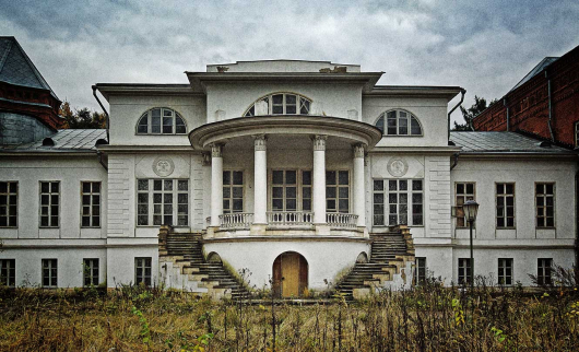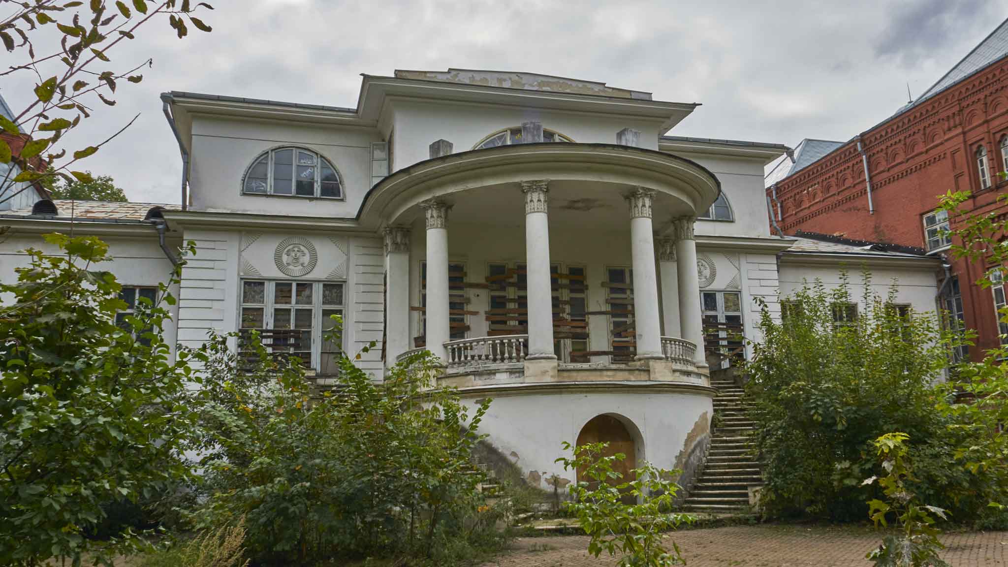 На фронтальной лестнице усадебного дома. Несмотря на обветшалость усадьбы, она сохранила былое величие.