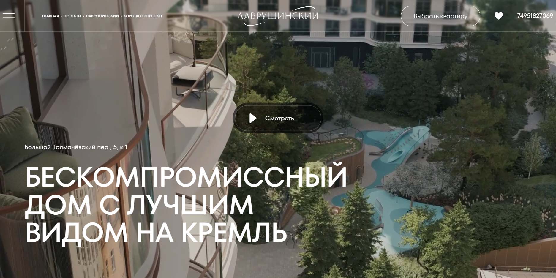 Элитный жилой комплекс в центре Москвы с большим двором-парком, фонтаном, ручьём, зонами активного и спокойного отдыха. Предлагает квартиры, пентхаусы и виллы. Жилье с панорамными окнами. Есть варианты квартир с эркерами и каминами, просторными балконами. Пентхаусы — с высокими потолками и террасами. На территории комплекса отдельно продумано пространство для детей с площадкой и игровой комнатой.