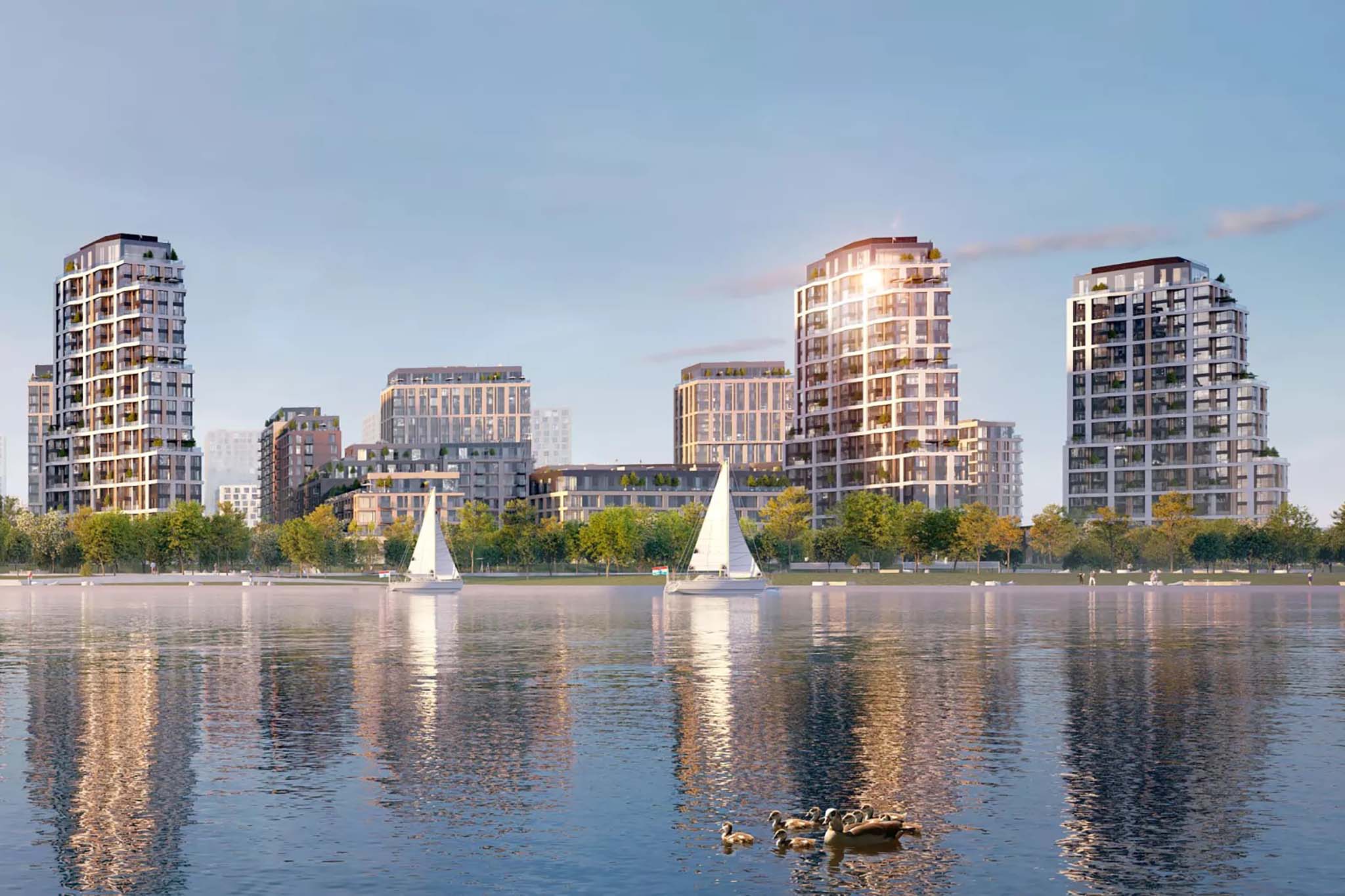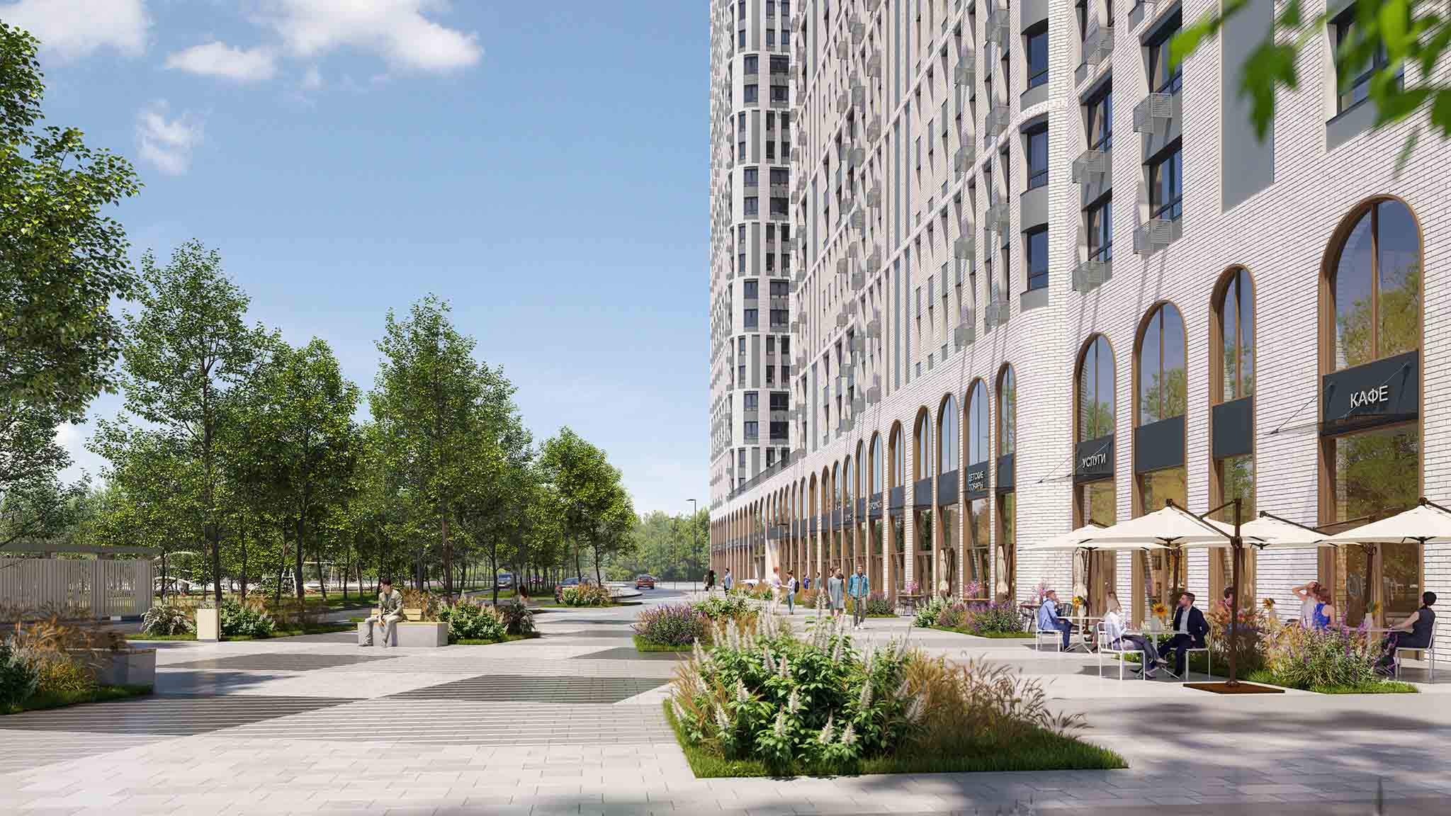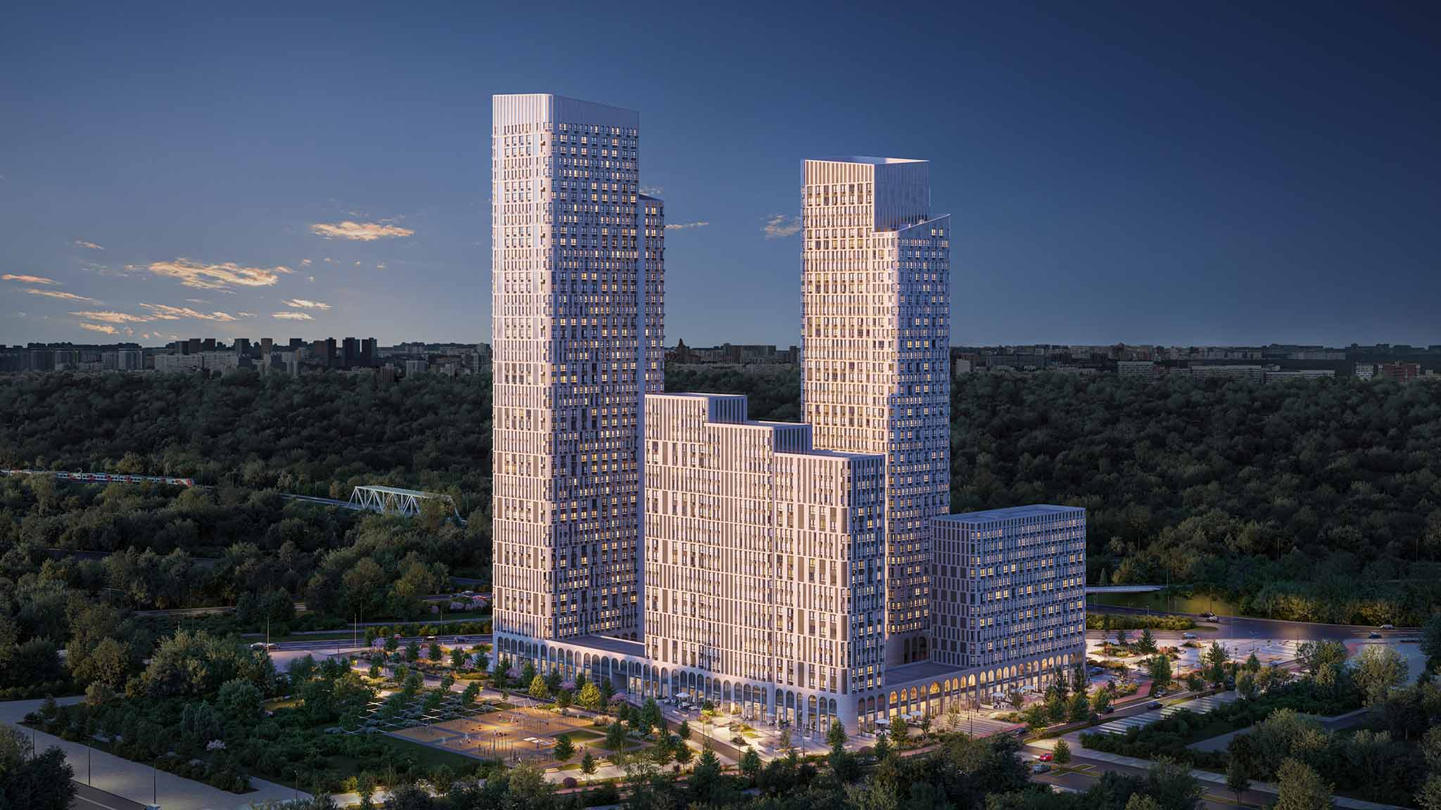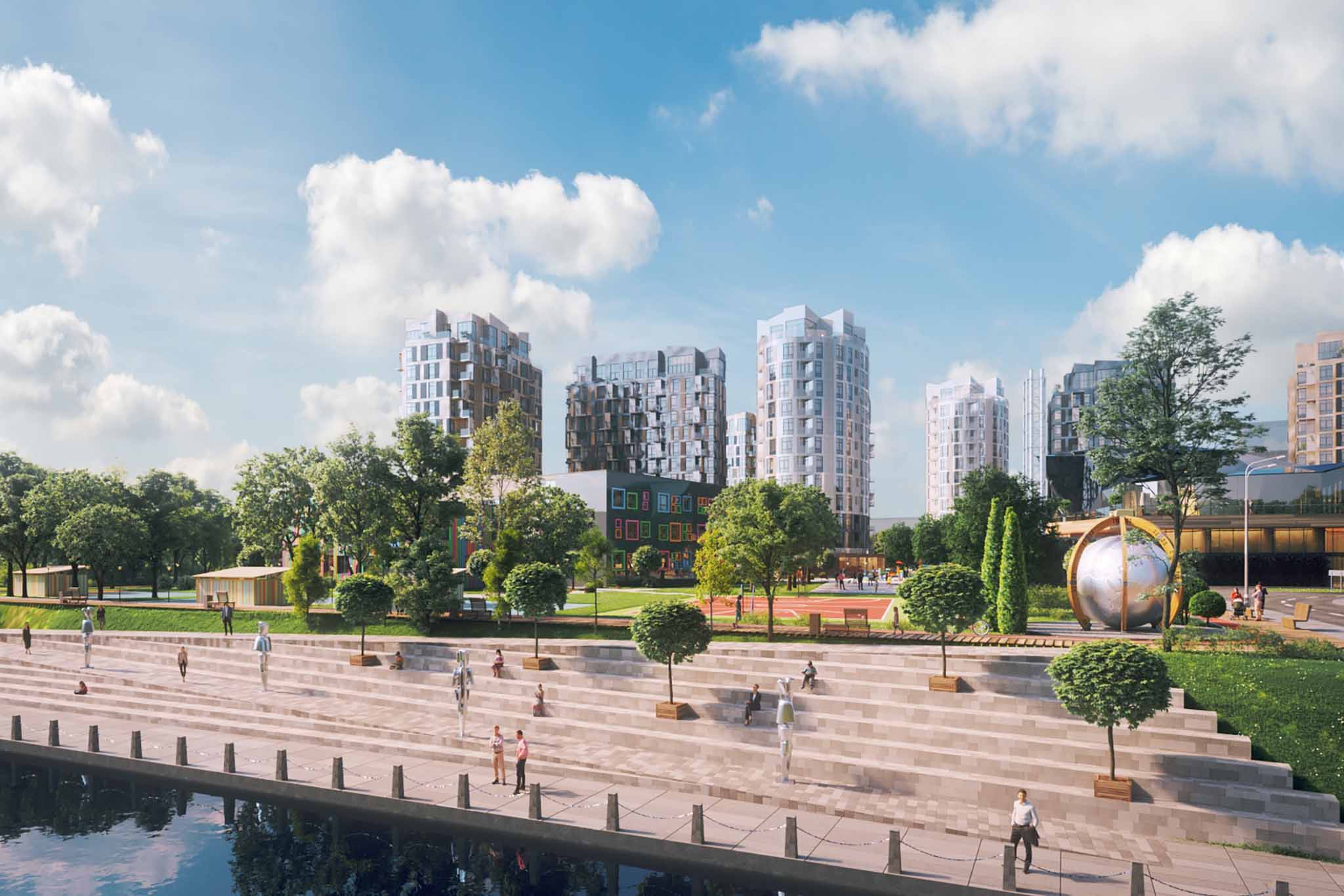 В состав комплекса входят три квартала на 4 700 квартир с закрытыми дворами по 5 000 кв. м. На территории планируются школа и детский сад. Рядом построят бизнес-центр с развитой инфраструктурой. Между кварталами благоустроят пешеходный бульвар.