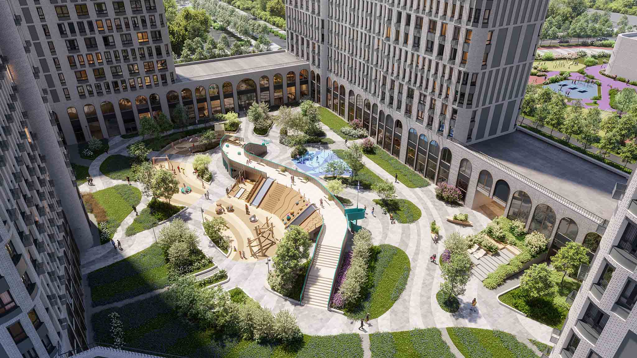 Приватный внутренний двор с двухуровневым благоустройством и ландшафтным дизайном. Здесь разместятся разнообразные зоны отдыха, детские игровые и спортивные площадки, а также сад медитаций, центральный променад и амфитеатр.