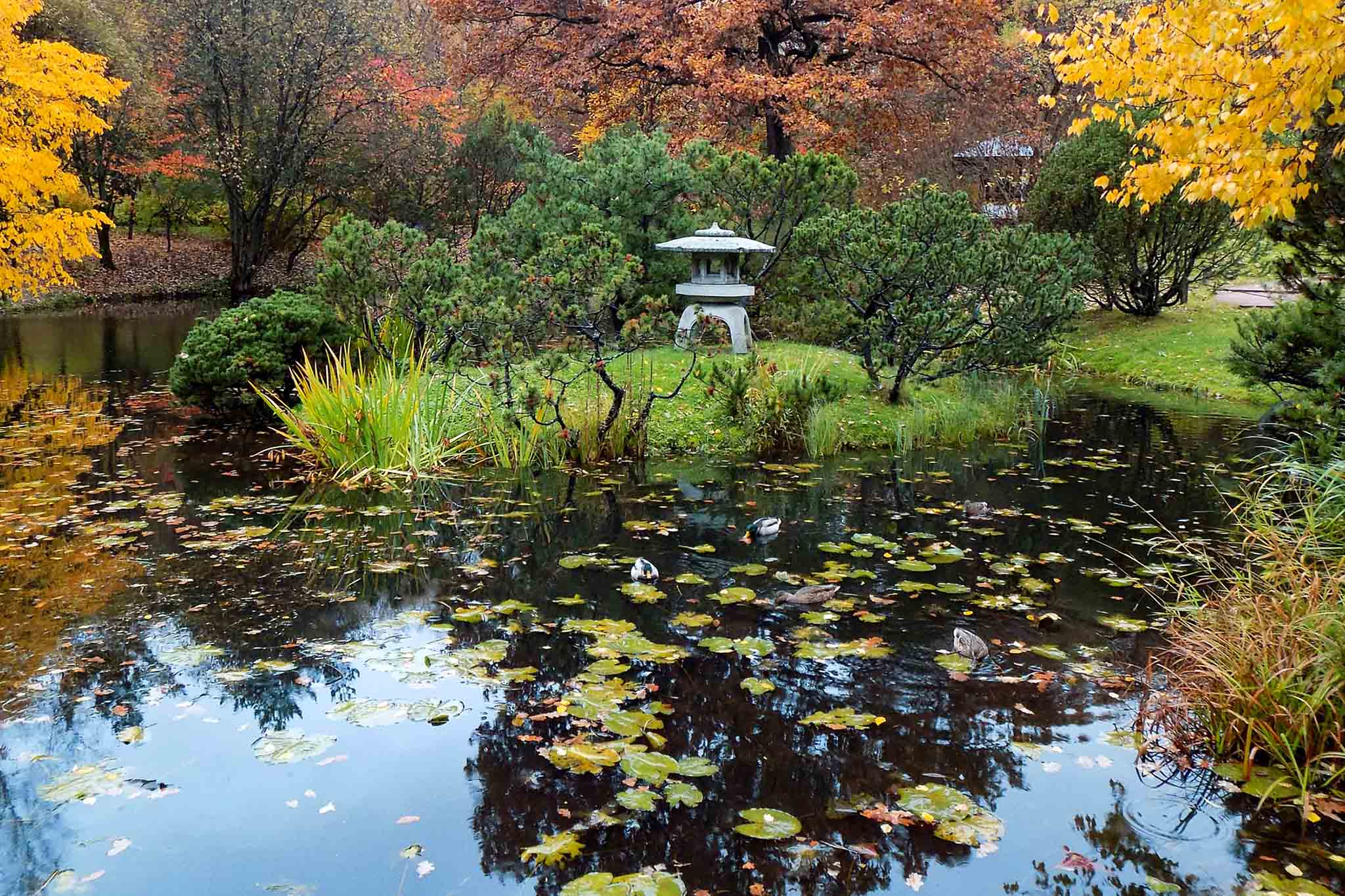 В октябре в огромном саду площадью 330 га можно провести целый день и при этом нисколько не устать. Вы получите большое удовольствие от вида ярко-желтых лиственниц, красочной листвы кленов, ярких ягод калины и рябины. Осенью на клумбах цветут нежные безвременники, астры и георгины.