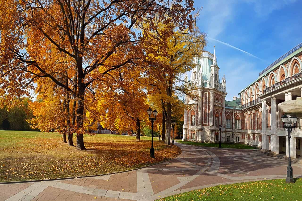 Чтобы найти уголок спокойствия в Москве, съездите в музей-заповедник «Царицыно». Осенью на темною гладь прудов роняют желтые листья вековые липы и вязы. Бывшая царская резиденция прекрасно отреставрирована.