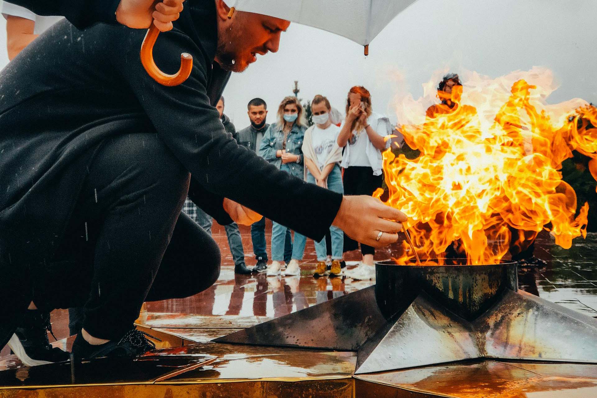 Первый Вечный огонь восстановили на этом кладбище в 2010 году, к 65-летнему юбилею Победы. Пламя — в центре звезды. Над ней — колокол, в который каждый может ударить в память о павших бойцах.