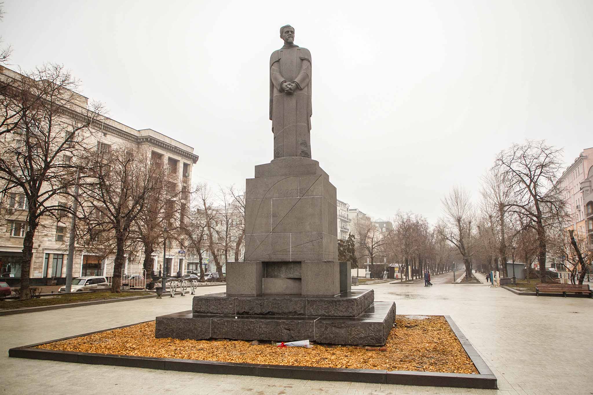Если присмотреться, сейчас можно увидеть шов на шее фигуры. Выщербины от осколков остались внизу мантии и около левой ноги скульптуры.