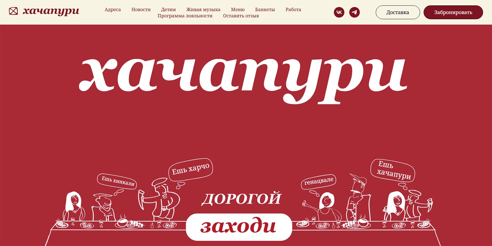 Сетевой ресторан в центре города оформлен в современном стиле и больше похож на стильное городское кафе. Умелые повара готовят более 10 видов хачапури — мегрельский, имеретинский, слоеный (пеновани), аджарский — в виде лодочки с сырной начинкой и яйцом, хачапури на шампуре. Есть детское меню и игровая комната для малышей.