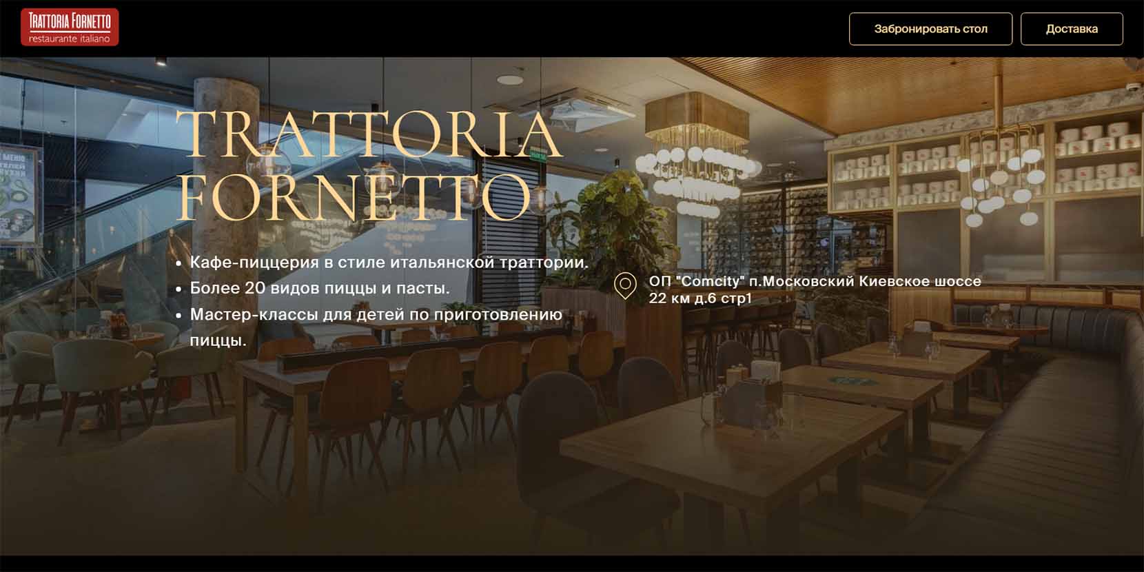 Ресторан Trattoria Fornetto находится на третьем этаже торгового дома «Метрополис» на Ленинградском шоссе. Формат домашнего итальянского заведения, где готовят около 20 видов пиццы. Есть вегетарианская, с мясом, морепродуктами и сырами. Здесь будет вкусно любителям классического исполнения блюда и тем, кто хочет «чего-нибудь новенького». Рекомендуют к заказу пиццу с креветками и трюфельным кремом и пиццу «Салями Милано».