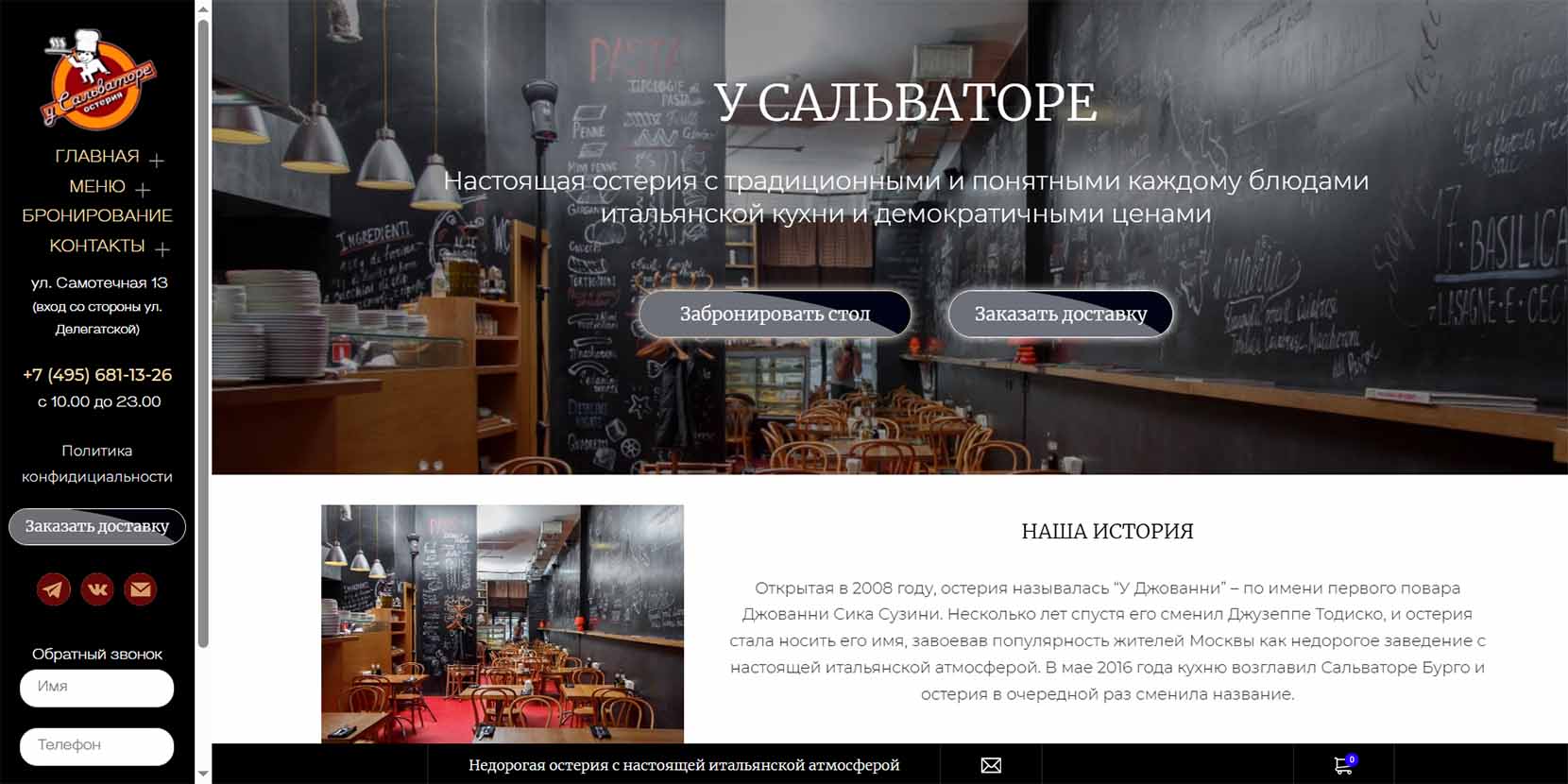 Домашний итальянский ресторан со стильным интерьером находится недалеко от метро Дмитровское. Огромные окна, винтажная мебель и шеф-повар, который говорит на итальянском, — все это создает иллюзию, что вы находитесь где-то на средиземноморском побережье. В меню 13 видов пиццы. Вкусные — все. Так что выбирайте, что вам ближе: классика или необычные начинки.